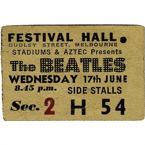 <B>Beatles Melbourne Concert Ticket Stub.</B></I> A used ticket from their June 17, 1964, performance at the Festival Hall in Melbourne, Australia. The show was the last in a three-day stint and was taped and later broadcast by Australian Channel 9. Ringo had re-joined the band at this point after being sidelined by illness and temporarily replaced by Jimmy Nicol. The stub is in Very Good condition with moderate wear.<BR><BR><b>Shipping:</b> Flat Material, Small (<a target="_blank" href="http://www.heritageauctions.com/common/shipping.php">view shipping information</a>)