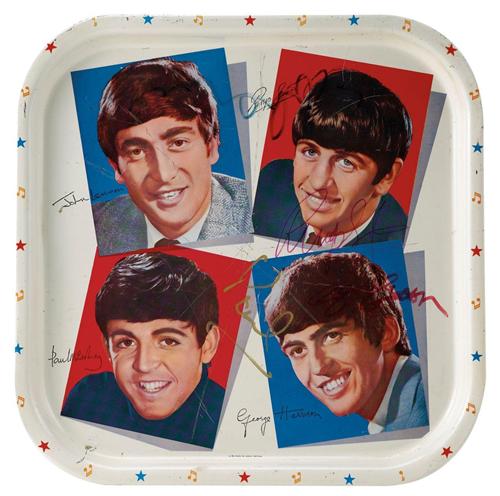 This 13 x 13” U.K. metal serving tray, which features four individual head shot photos of each group member, was actually piece of memorabilia available in 1964. All four have signed the tray at different times as solo artists. John Lennon has signed in blue marker. This signature was obtained on May 18 in Philadelphia at the ‘WFIL Helping Hands Marathon’, where John was the special guest host. Paul McCartney has signed in first name, in gold paint pen. This signature was obtained on October 23, 1984 on the set of ‘The Tonight Show’ in Los Angeles. George Harrison has signed in red marker. This signature was obtained on August 24, 1992 in Los Angeles after he taped a segment for the ‘Rockline’ radio show. Ringo Starr has signed “Ringo St” in purple marker. This signature was obtained in Los Angeles in the summer of 1992, outside of KLOS FM radio station. Beatles signed 3D memorabilia items are extremely rare, as are complete sets of Beatles autographs put together after the breakup of the band. This is the only fully signed Beatles tray to surface to date. Comes with an LOA from Frank Caiazzo.