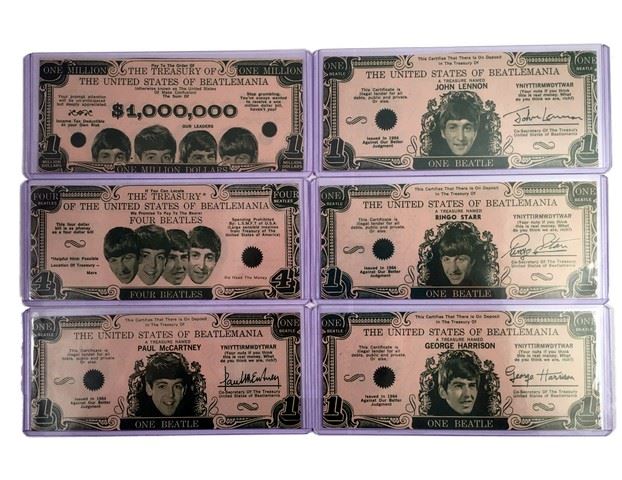 Beatles Money set of 6 Original Currency Bills 1964 - The rare and fabled original Beatles money complete set. These are original to 1964 and are rarely found together as a set.
