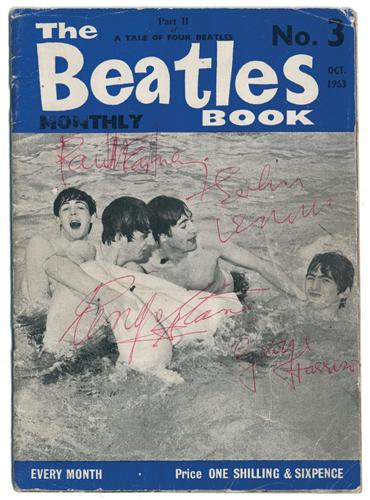 Here is a copy of ‘The Beatles Book Monthly’ No. 3, from October 1963, which features a photo of the Beatles frolicking in a pool on the front cover. All four have signed on this cover very nicely in red ballpoint pen, near their respective image. This book was signed by the Beatles in late 1963, shortly after this issue of the magazine was published. Beatles signed magazines are always desirable.