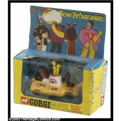 Beatles - Music Memorabilia, "Yellow Submarine" Corgi Toy (1968). Made in 1968 in England with the release of the Beatles' animated feature, this original Corgi die-cast Yellow Submarine toy has revolving periscopes and two opening hatches, it is in its original box. The toy has the embossed printing on the bottom, and the box has the brown interior to assure that this is not the later reproduction. The box still has the plastic interior mold, but its cellophane window has broken. Very Fine. ***** Important notice: Heritage usually auctions material at the rate of 200-250 lots per hour. On some occasions eBay Live bid software or the Internet may not be able to keep up with the pace of the auction. We recommend placing a realistic absentee bid now as insurance to avoid disappointment. Occasionally the auctioneer may eliminate or reject an eBay Live bid, and the auctioneer may also reopen a lot after the close of the eBay live bidding (usually because we missed an audience bid), and may reject your bid even if it shows you as the winning bidder. By bidding via eBay Live, you agree that Heritage may award the lot to another bidder at its sole discretion under the circumstances described above or any other reasonable circumstances. Also please note that all Heritage lots purchased through eBay Live carry a 20% Buyer's Premium. Please make sure you read the Terms and Conditions before you bid.