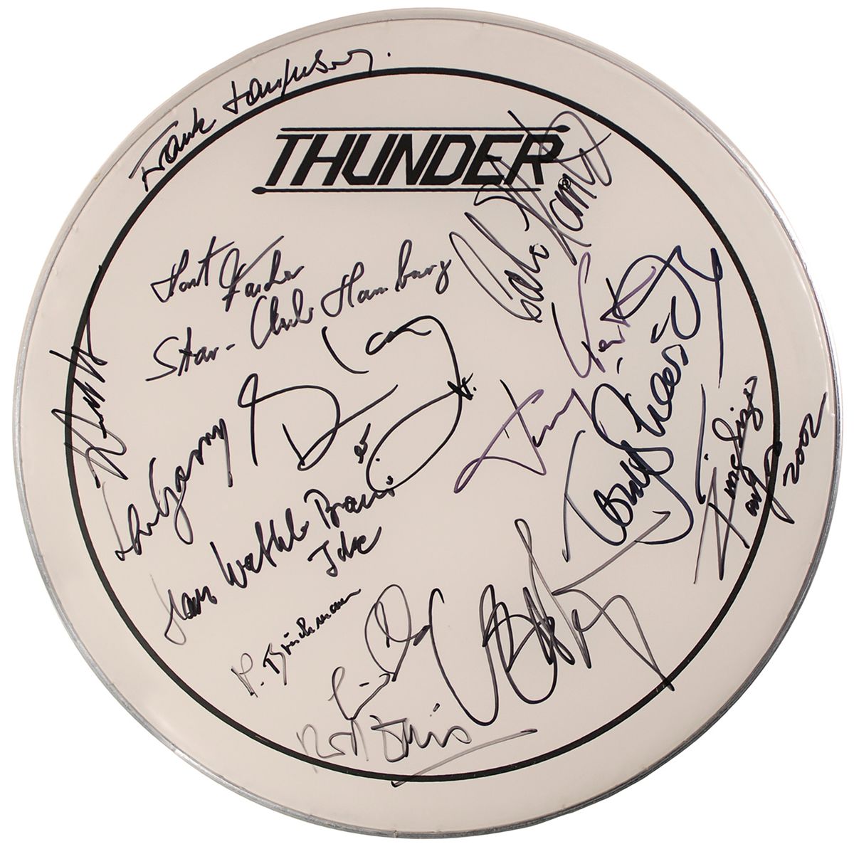 Unused 16.5” Thunder drumhead, signed in black felt tip by various people associated with the Beatles. Signers are: Len Garry, Colin Hanton, Rod Davis, and Eric Griffith of The Quarrymen; Tony Sheridan; Horst Fascher, Star-Club manager; Hans-Walter ‘Icke’ Braun, a friend from Hamburg; Peter Bruchmann, photographer at the Top-Ten Club; Ulf Kruger, Astrid Kirchherr’s manager; Kingsize Taylor, frontman of the Star-Club’s band; Hans Olof Gottfridsson, author; Blair Cunningham, drummer for Paul McCartney in 1992-3; Tommy Kent, singer; and Frank Laufenberg, German TV presenter. In fine condition.