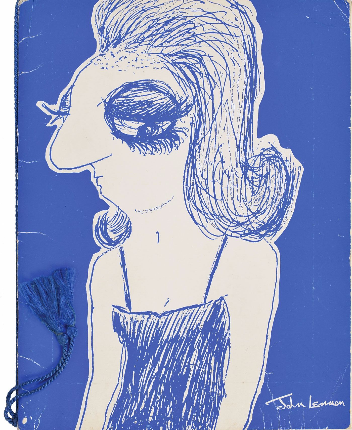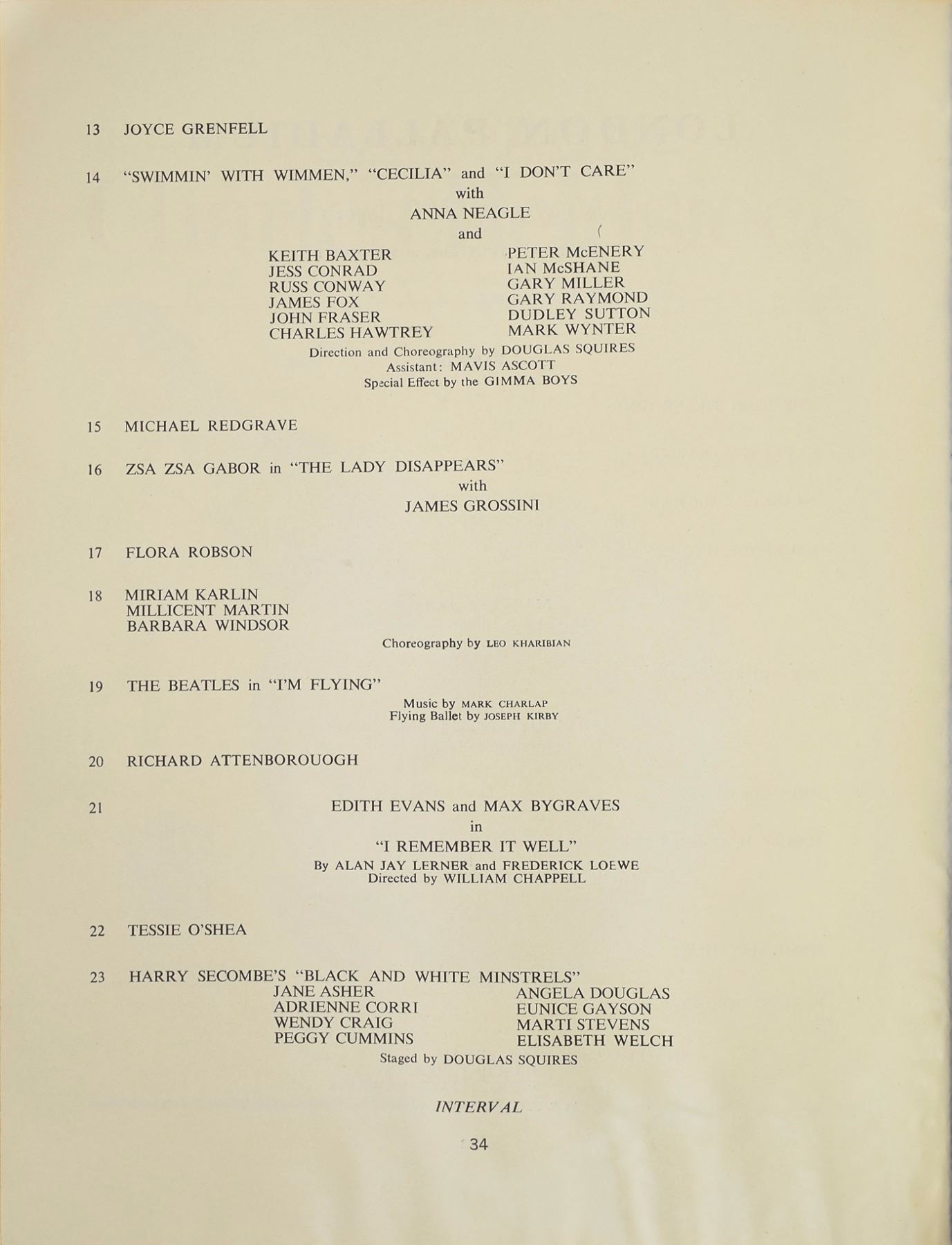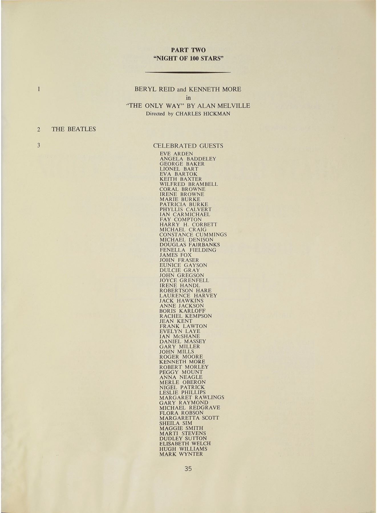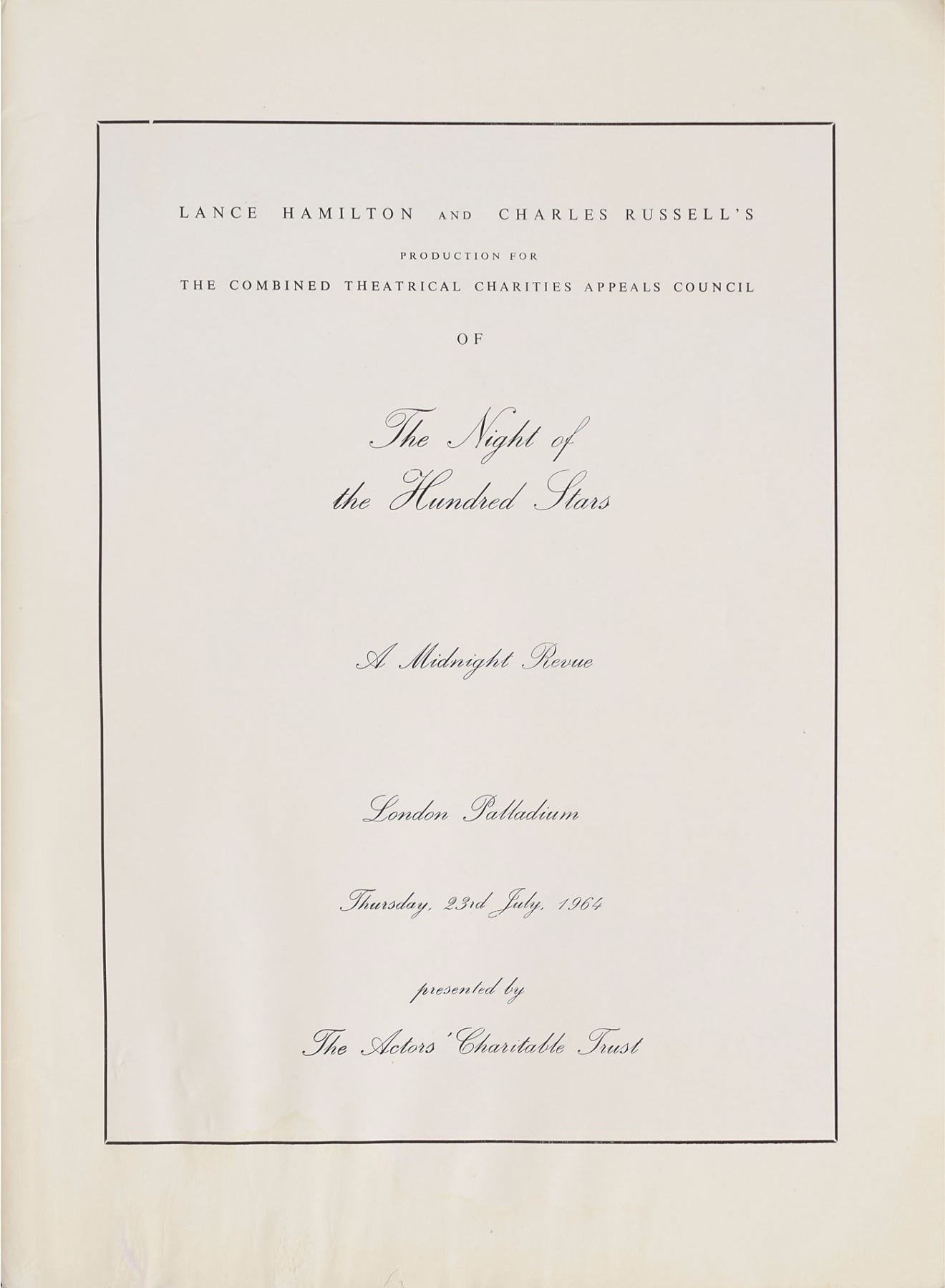 Rare program for "The Night of the Hundred Stars: A Midnight Revue," a charity event held at the London Palladium on July 23, 1964, presented by the Actors' Charitable Trust, 9 x 11.25, 68 pages. The front cover features a caricature of Cilla Black designed by John Lennon. During the first part of the show, the Beatles acted in a ballet sketch entitled 'I'm Flying,' in which they were suspended high above the stage; they also gave a brief musical performance during 'Part Two' of the event. Judy Garland, who wasn't initially scheduled to appear, brought down the house with her famous version of 'Over the Rainbow.' In very good condition, with scattered creasing and dampstaining to inside pages.