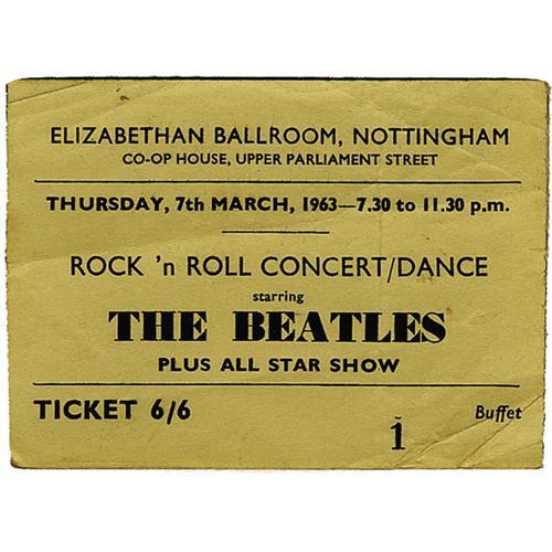 <B>Beatles Nottingham Concert Ticket.</B></I> A used ticket for a March 7, 1963 all-star performance that featured the Beatles, Gerry and the Pacemakers, the Big Three, Billy J. Kramer with the Dakotas, and Bob Wooler. It was the first of six such engagements that would become known as the "Mersey Beat Showcase" tour. The ticket is in Very Fine condition with moderate wear and creasing.