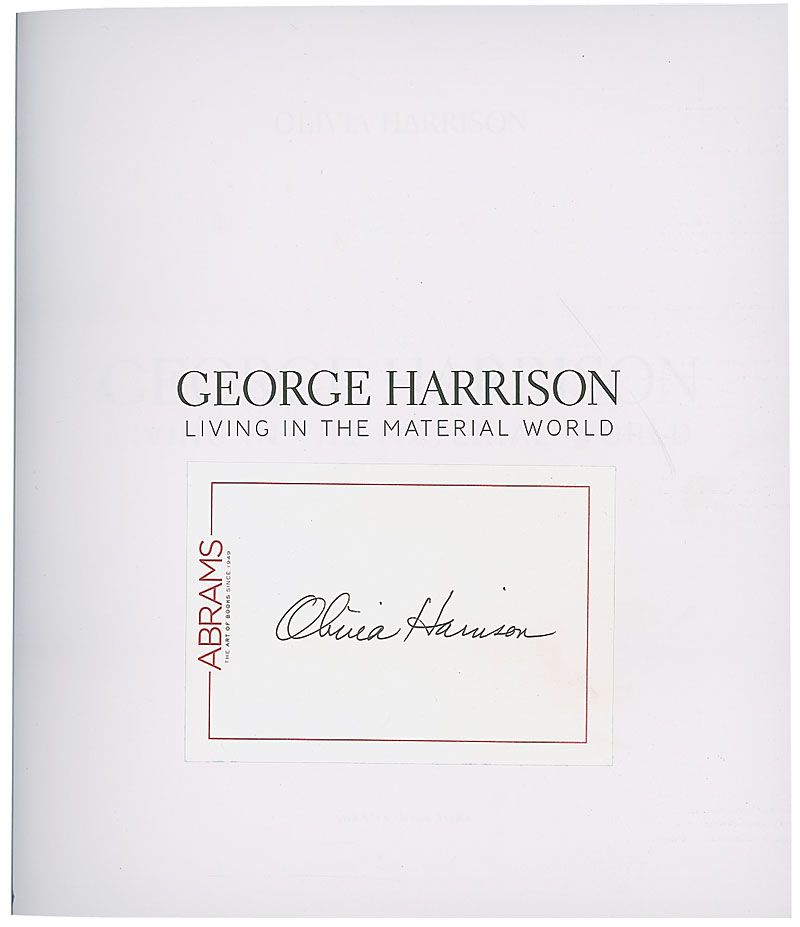 Signed book: George Harrison: Living in the Material World. First edition. NY: Abrams, 2011. Hardcover with dust jacket, 9.75 x 11, 399 pages. Signed on a bookplate affixed to the half-title page in black felt tip, “Olivia Harrison.” In fine condition. Accompanied by a photo taken at the time of Harrison’s signing and a flyer from the event.
