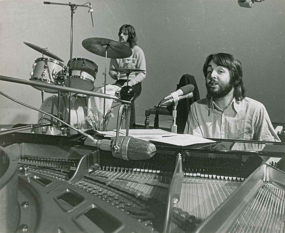 Pair of vintage glossy 10 x 8 photos of the Beatles during the 1970 recording of the band's final studio album, Let It Be. One photo depicts Paul McCartney singing behind his piano with Ringo Starr drumming in the background, and the other photo is of a slightly wider angle, which now reveals John Lennon and George Harrison, both of whom are playing the guitar. In overall fine condition. Consignor notes that the photographs were available to purchase by British cinemas for the promotion of the film. Accompanied by a certificate of authenticity from Tracks.