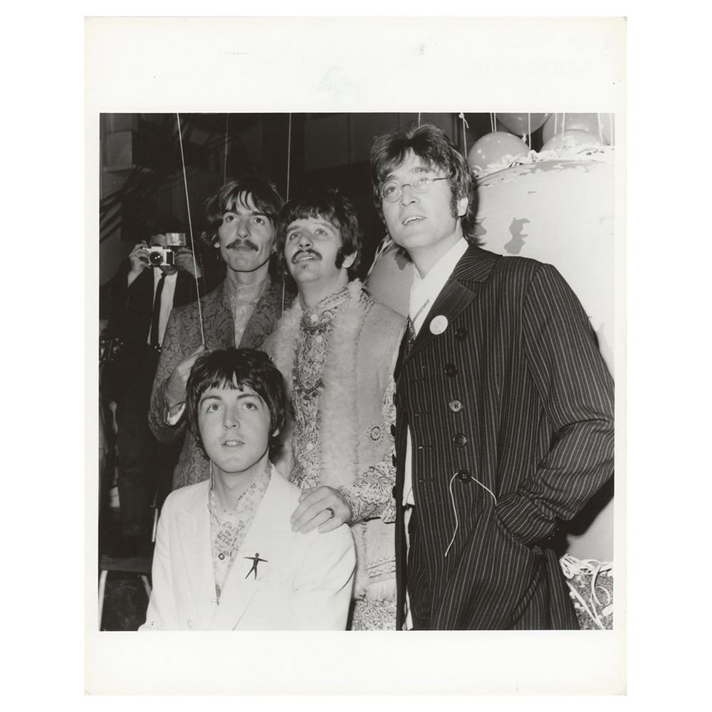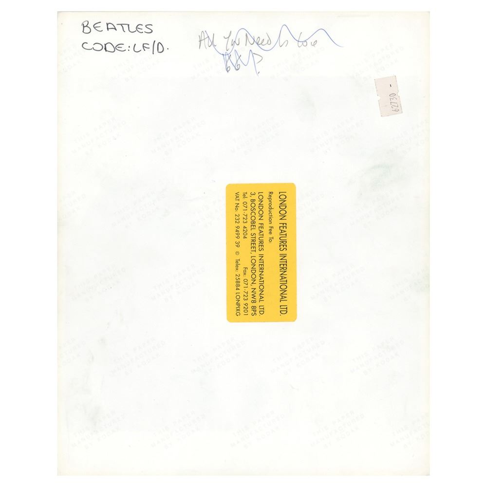 Original glossy 8 x 10 silver gelatin photograph of the Beatles in the mid-to-late 1960s, printed from the original negative circa 1970s-80s. Reverse bears a London Features International credit label and "This Paper Manufactured by Kodak" watermarks. In fine condition.