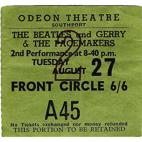 <B>Beatles/Pacemakers Southport Concert Stub.</B></I> A used ticket from their August 27, 1963, performance with Gerry and the Pacemakers at the Odeon Theatre in Southport. It was the first of a six night residency at the venue, with two shows per night (this ticket was for the 8:40 p.m. second performance). Earlier in the day, the band had shot footage with a BBC TV crew for a documentary about the "Mersey Beat" boom. The ticket is in Fine condition with with a couple of fold creases and a little bit of wrinkling.<BR><BR><b>Shipping:</b> Small Flat (<a target="_blank" href="http://www.heritageauctions.com/common/shipping.php">view shipping information</a>)
