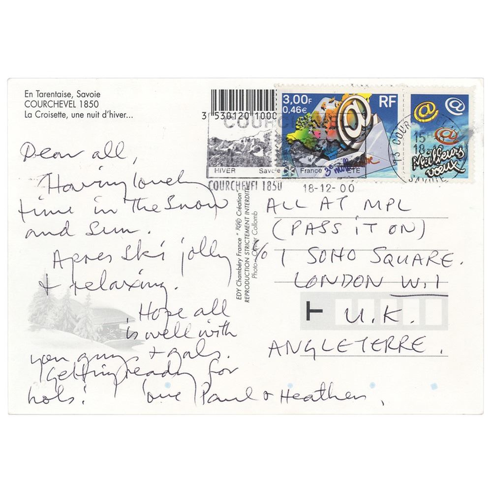 ALS signed “Love, Paul & Heather,” penned on the reverse of a 5.75 x 4.25 postcard of the Courchevel Ski Resort in Savoie, France, postmarked December 18, 2000. Handwritten letter sent to his staff at McCartney Productions Limited, in full: ‘Dear all, Having lovely time in the snow and sun. Apres ski jolly + relaxing. Hope all is well with you guys + gals. Getting ready for hols!” McCartney has also addressed the card: “All at MPL (Pass it on) c/o 1 Soho Square London W.1 U.K. Angleterre.” In fine condition. Accompanied by a certificate of authenticity from Tracks.