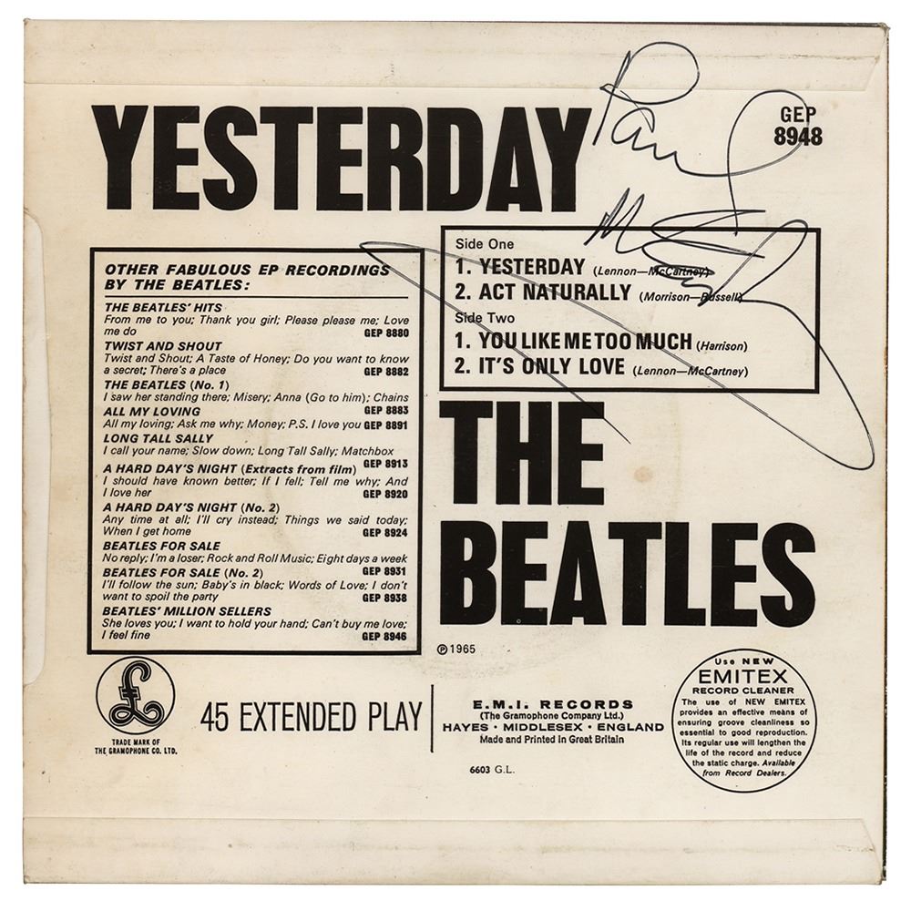 UK Parlophone 45 RPM vinyl pressing of the 1965 Beatles EP 'Yesterday,' signed on the reverse in black ink by Paul McCartney. The consignor notes that the signature dates to 1983. In fine condition. The record is included.