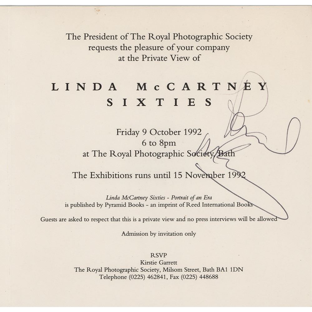 Desirable 5.75 x 5.75 invitation to a private viewing of Linda McCartney's 'Sixties' exhibition held at the Royal Photographic Society, Bath, on October 9, 1992, signed inside in black ballpoint by Paul McCartney. In fine condition, with light handling wear. Accompanied by a certificate of authenticity from Tracks.
