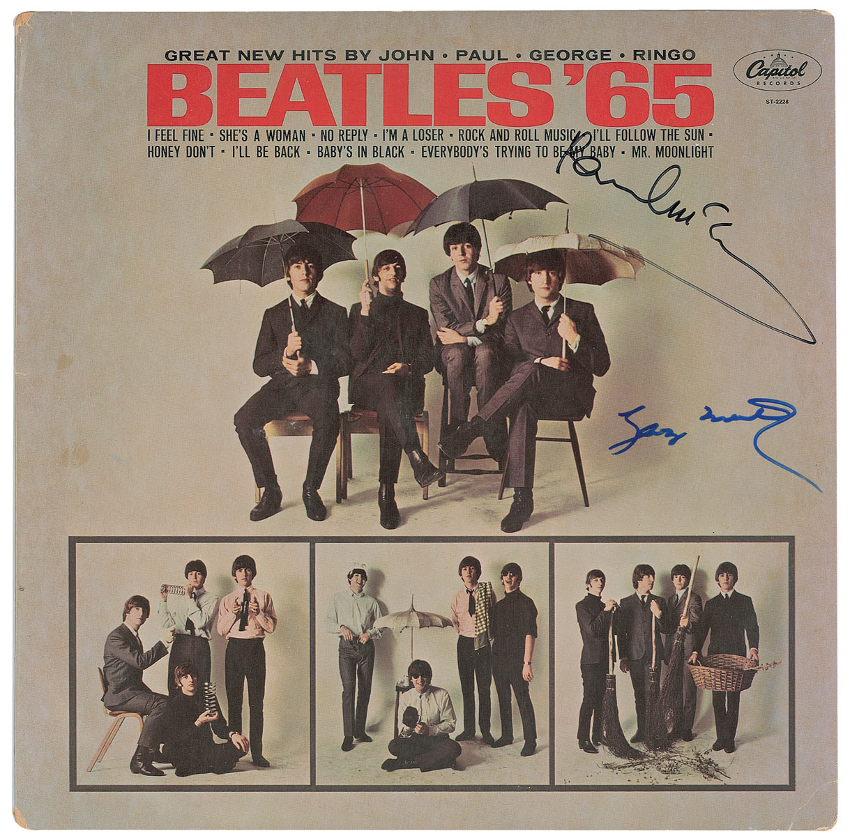 Beatles ‘65 album signed in black felt tip “Paul McCartney” and in blue felt tip “George Martin.” A few bends and creases, some spots of staining along the left side, and paper chipping to the corners, otherwise fine condition. The record is included. Accompanied by a letter of authenticity from Perry Cox. A seldom-seen combination of the famed producer and a Beatle.