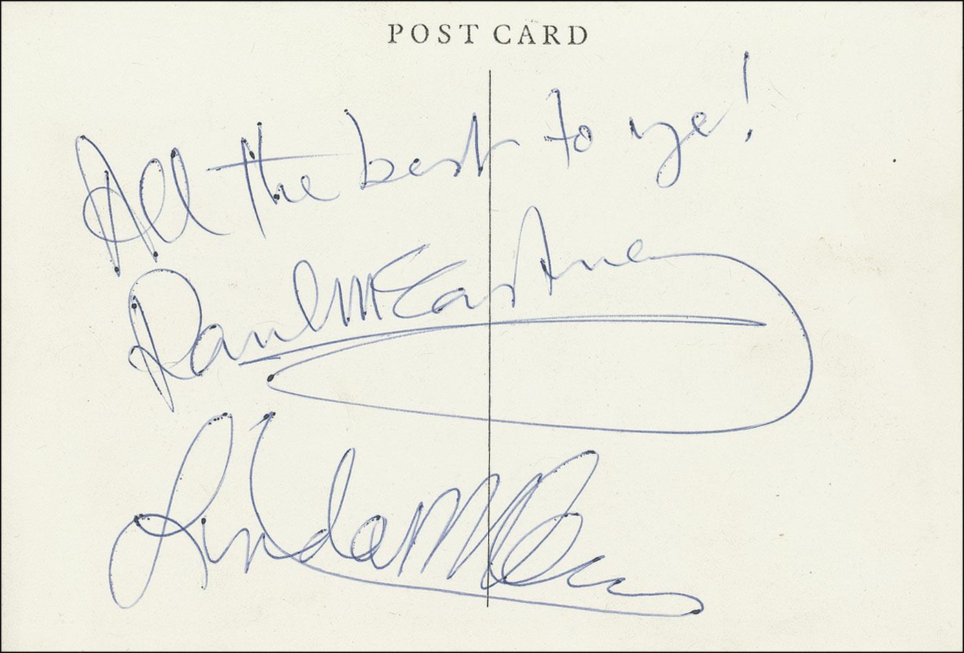 Wings promotional 6 x 4.25 postcard photo, signed on the reverse in blue ballpoint by Paul McCartney and Linda McCartney, with Paul adding above his autograph “All the best to ye!” In very fine condition. Accompanied by a letter of provenance from the original recipient of the signatures stating “signatures of Paul and Linda McCartney were given to me personally by them outside their home in St. John’s Wood, London in the mid 70’s.” Also accompanied by a letter of authenticity from noted Beatles expert Perry Cox, as well as a certificate of authenticity from Tracks. An especially large and attractive example.