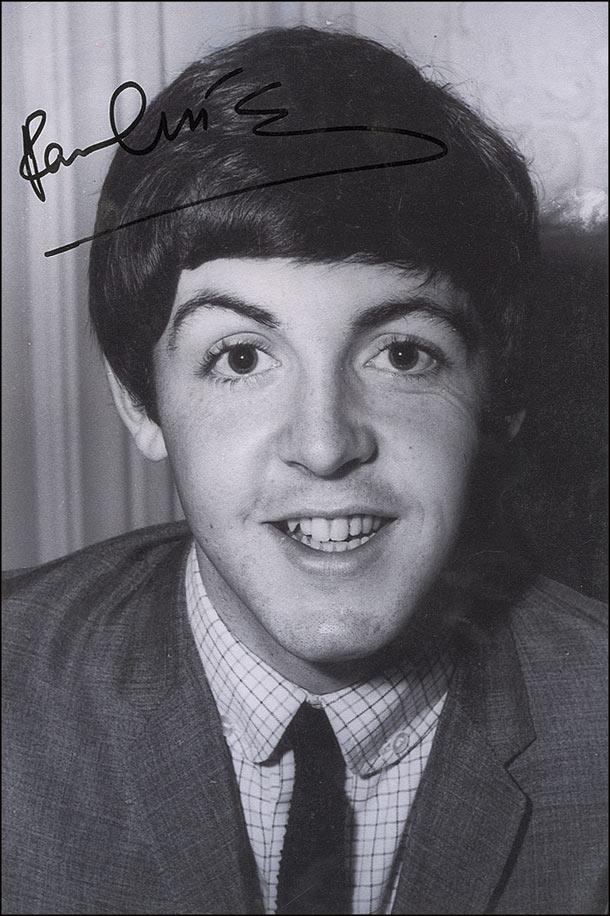 Glossy 8 x 12 head-and-shoulders photo of a young McCartney in a jacket and tie, signed in black felt tip. Some scattered light surface marks and light contrast to last name of signature, otherwise fine condition.