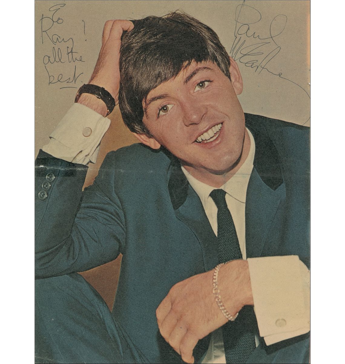 Adorable color vintage 10 x 13 magazine photo of the front man, signed and inscribed in black ballpoint, “To Ray! all the best, Paul McCartney.” In very good condition, with a central horizontal fold, a piece of reparative tape to the fold at the left edge, light toning, and a few trivial edge tears.