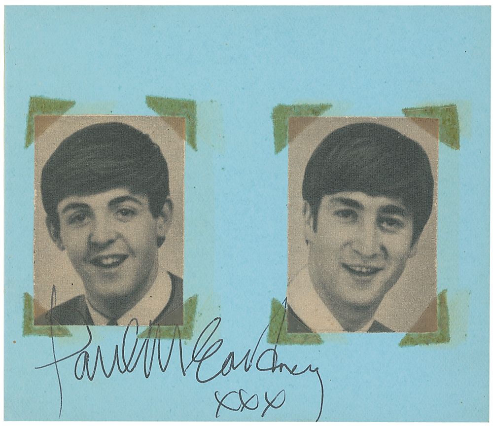 Vintage ballpoint signature, “Paul McCartney xxx,” on a light blue 4.5 x 4 album page, with clipped photos of McCartney and John Lennon affixed to the page. Signature is still housed in its original autograph album, with clipped photos of Ringo and George on the adjacent page. In fine condition, with a small portion of McCartney’s signature going over the tape and onto the bottom of the image. Accompanied by a certificate of authenticity from Tracks.