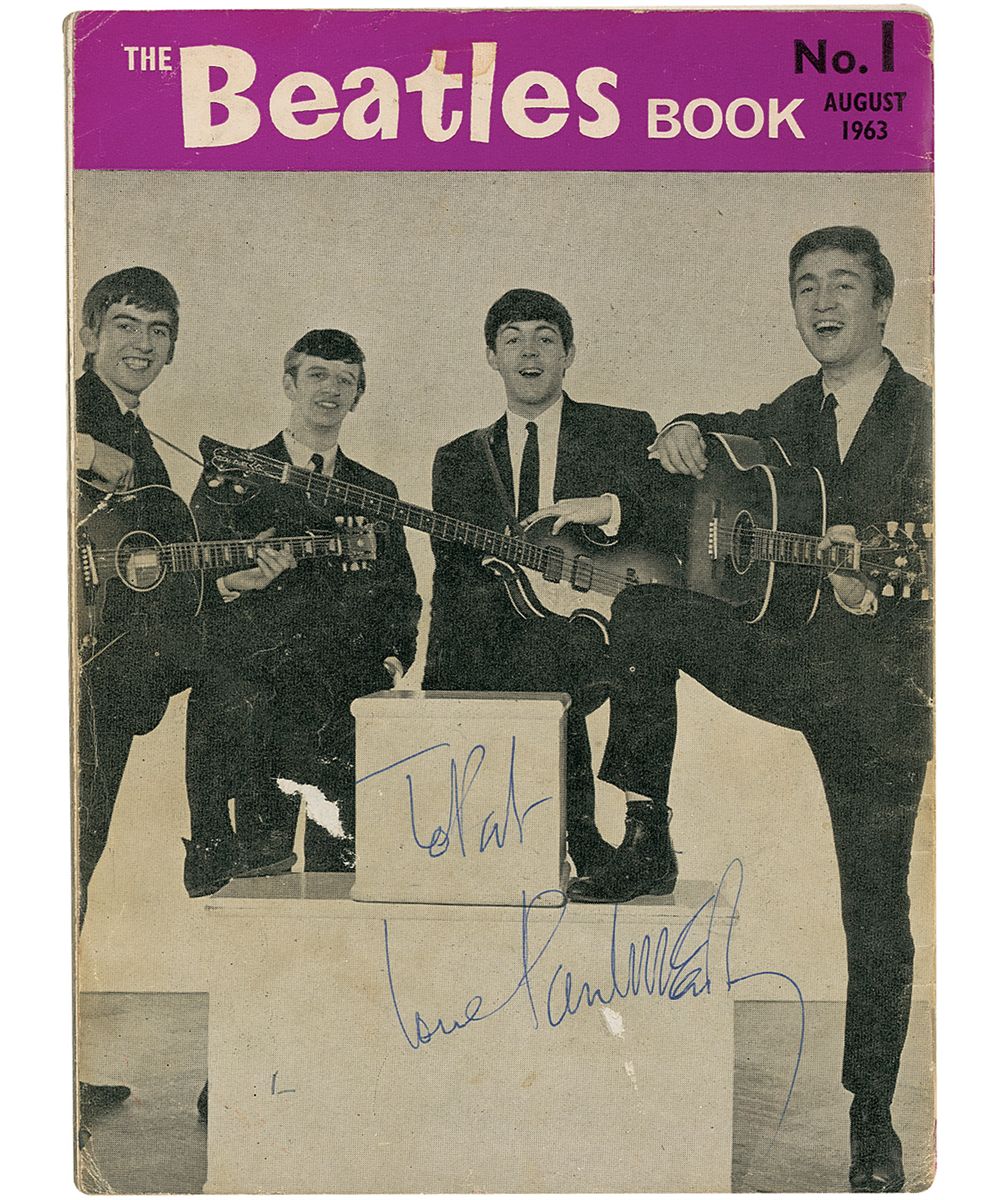 A copy of the first ever edition of The Beatles Monthly book, published in August 1963, 6 x 8.25, full of photos and biographies of the band, as well as Brian Epstein and George Martin, signed and inscribed on the back cover in blue ballpoint, “To Pat, Love, Paul McCartney.” The front cover bears a secretarial John Lennon signature and inscription. In very good condition, with scattered toning and creasing to covers.