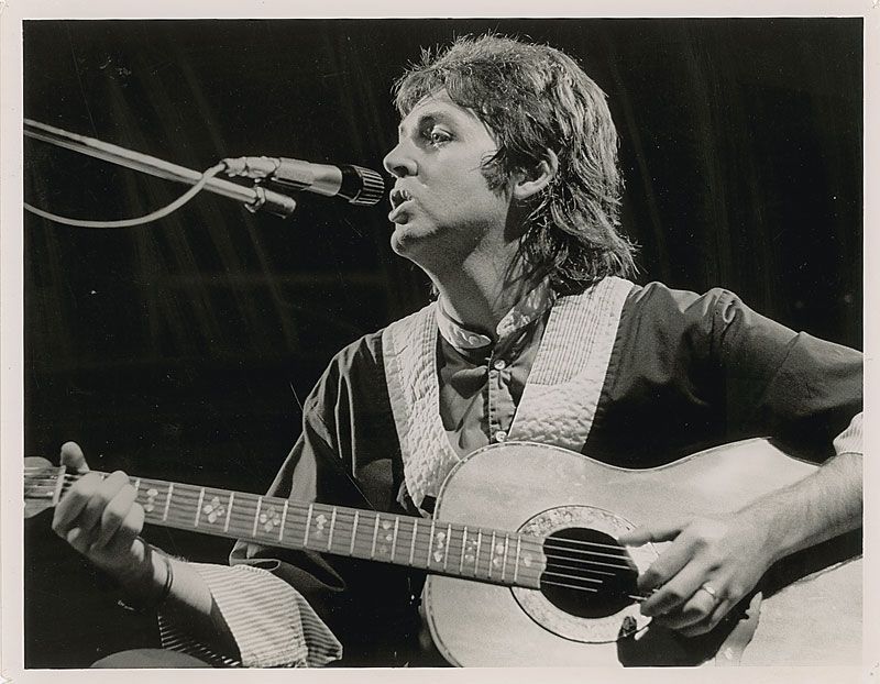 Original unsigned glossy 14 x 11 photo of McCartney singing and playing guitar during a concert, by Richard Creamer. Tack holes with small tears to the corners, otherwise fine condition. Provenance: Richard Creamer Estate. Creamer was a famous Rolling Stone photographer very active and well known in the 1970s Los Angeles Rock scene. The collection of Creamer photos offered in this auction were kept in his personal collection and several appeared in magazines.