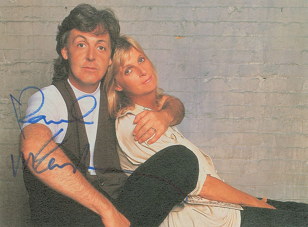 Color 6 x 4.25 MPL postcard photo of Paul and Linda McCartney, signed in blue felt tip by Paul. In fine condition, with a bit of light contrast to portion of last name of signature. Accompanied by a certificate of authenticity from Tracks.