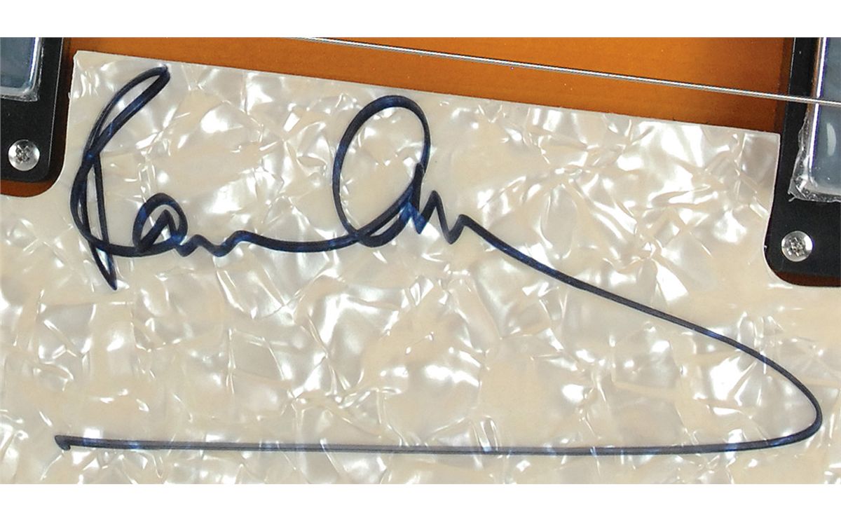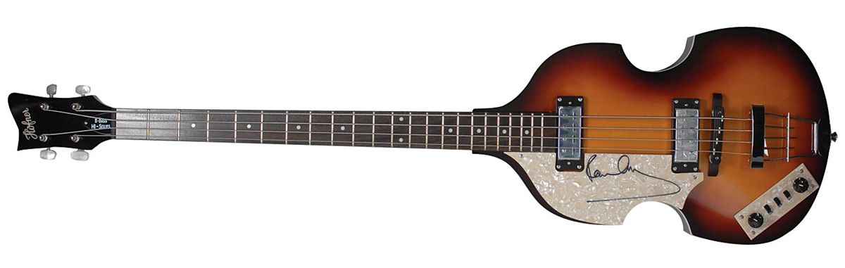 Beautiful left-handed sunburst-finish Hofner ‘violin’ or ‘Cavern’ B-Bass HI-Series bass guitar, beautifully signed on the pearloid pickguard in black felt tip. In fine condition. Accompanied by a letter of authenticity from noted Beatles expert Frank Caiazzo, in which he writes, “This signature was obtained in person in 2010.” Oversized.