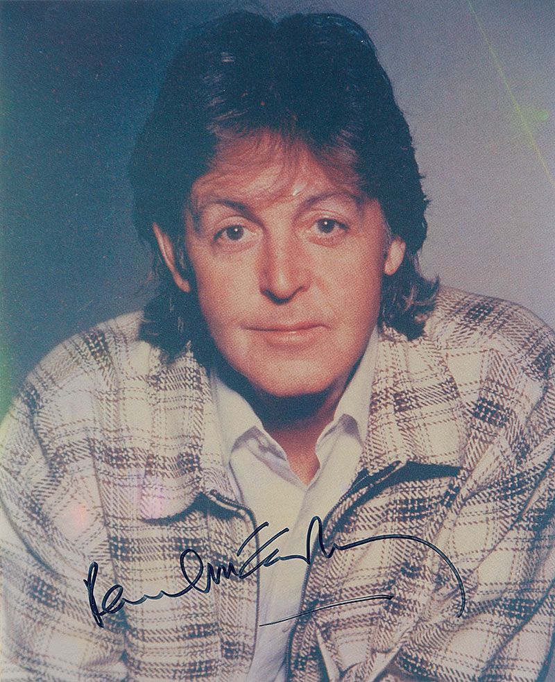 Color glossy 8 x 9.75 photo of McCartney in a plaid jacket, signed in black felt tip. In fine condition, with a crease to top right corner.