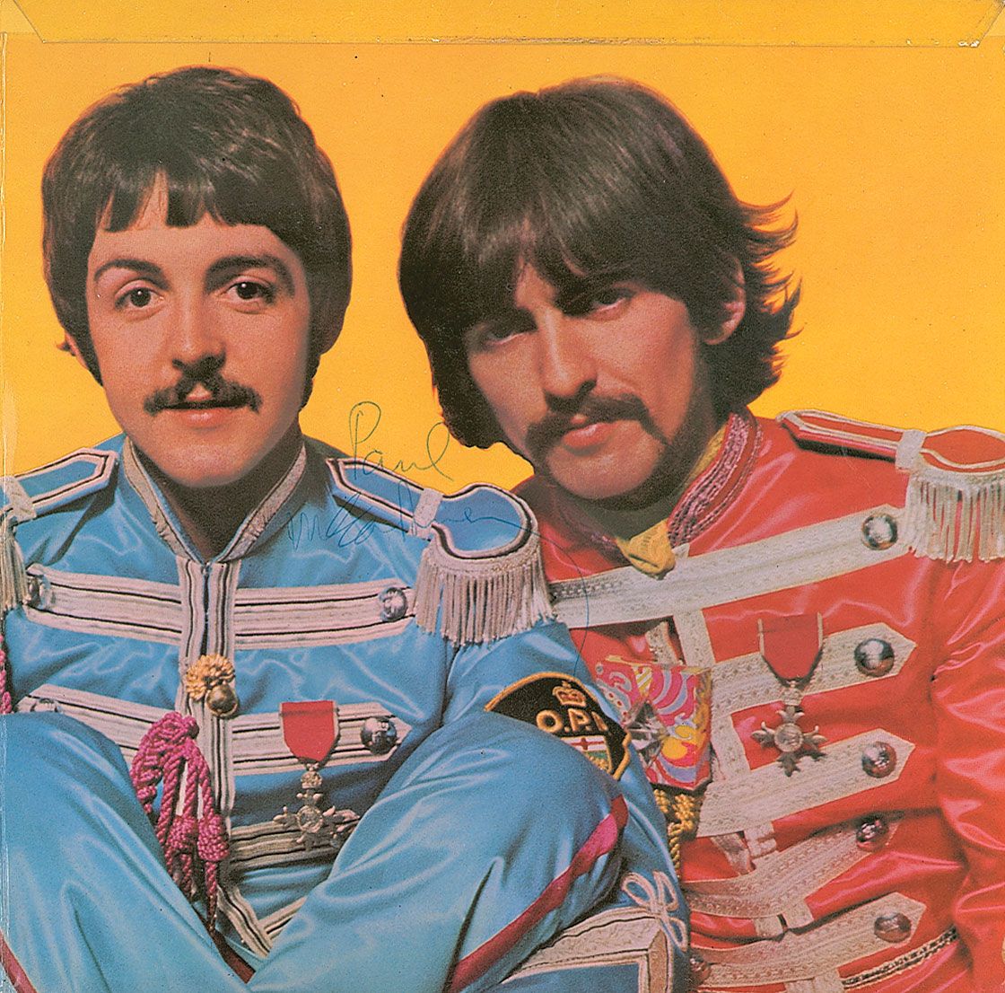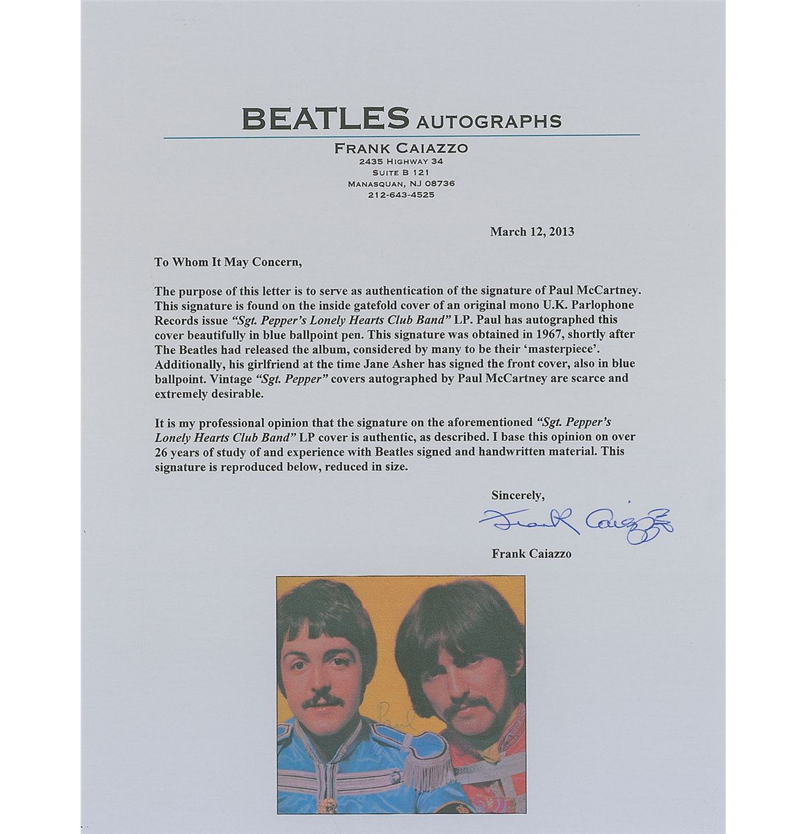 Original mono UK Parlophone Records issue Sgt. Pepper’s Lonely Hearts Club Band album signed on the inside gatefold in blue ballpoint by McCartney. Also signed on the front cover in black ballpoint by his then-girlfriend Jane Asher. In fine condition, with some light creasing to front cover and some mild contrast to last name of signature against his blue uniform. The record is not included. Accompanied by a letter of authenticity from noted Beatles expert Frank Caiazzo, who states, “This signature was obtained in 1967, shortly after the Beatles had released the album…Vintage ‘Sgt. Pepper’ covers autographed by Paul McCartney are scarce and extremely desirable.” Also accompanied by letters of authenticity from Beatles expert Perry Cox and Tracks.