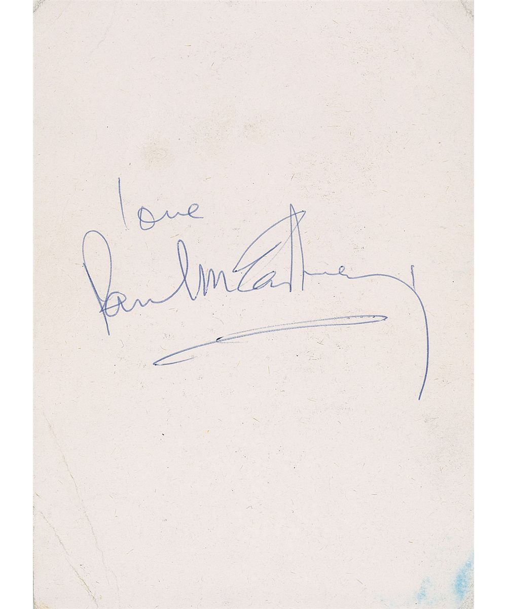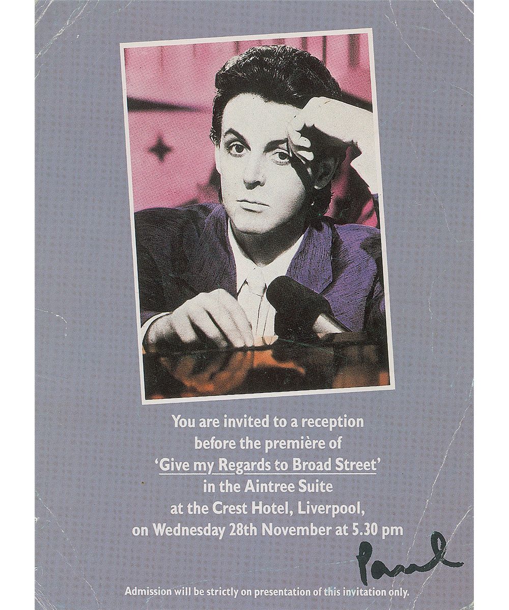 Color 5.25 x 7 invitation, featuring a small image of McCartney and reading, “You are invited to a reception before the premiere of Give My Regards to Broad Street in the Aintree Suite at the Crest Hotel, Liverpool, on Wednesday 28th November at 5.30 pm.” Signed on the reverse in blue ballpoint, “love, Paul McCartney.” Creasing to all four corners on reverse, with scattered creases to front, and an impression from signature, otherwise fine condition.