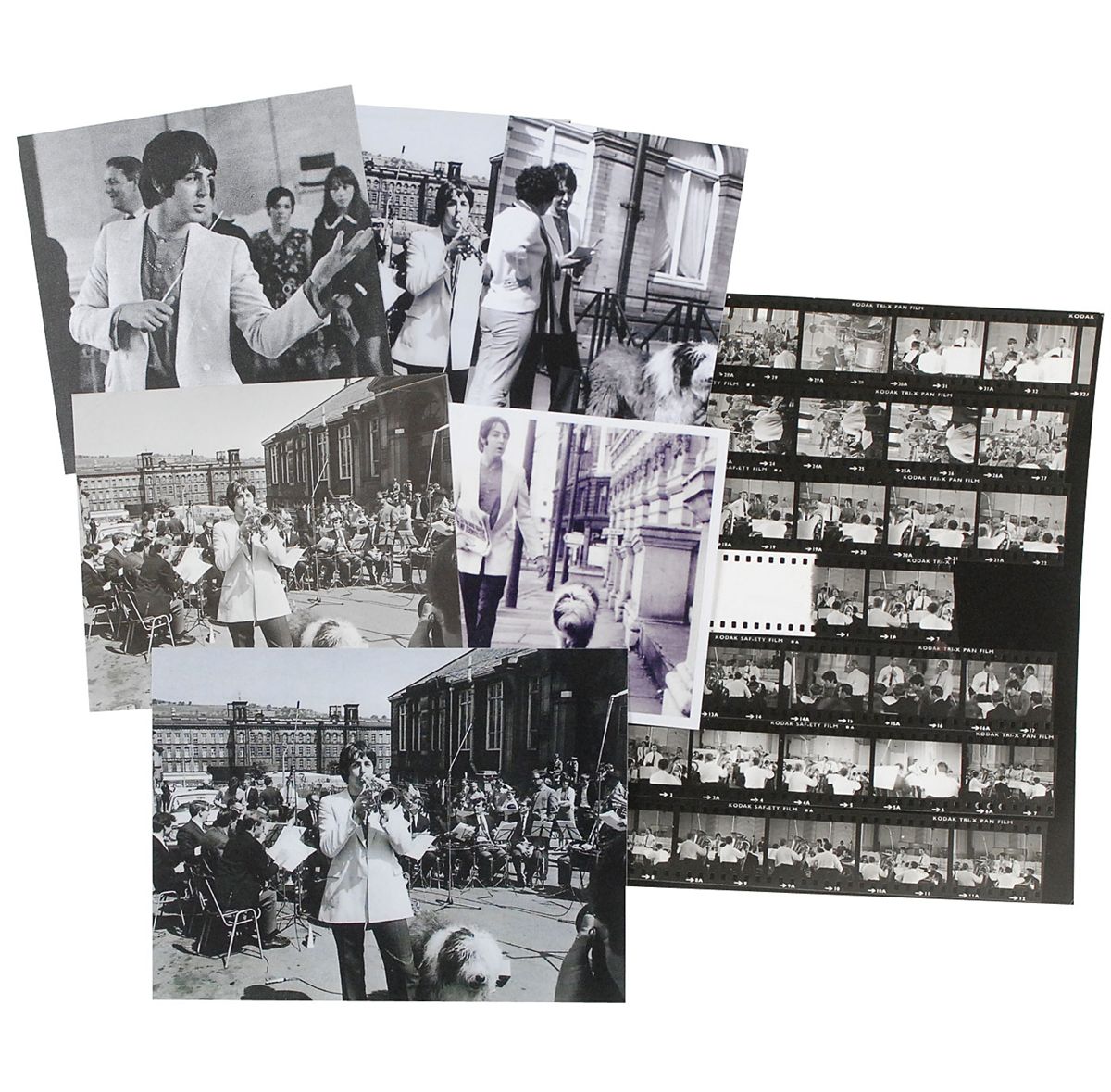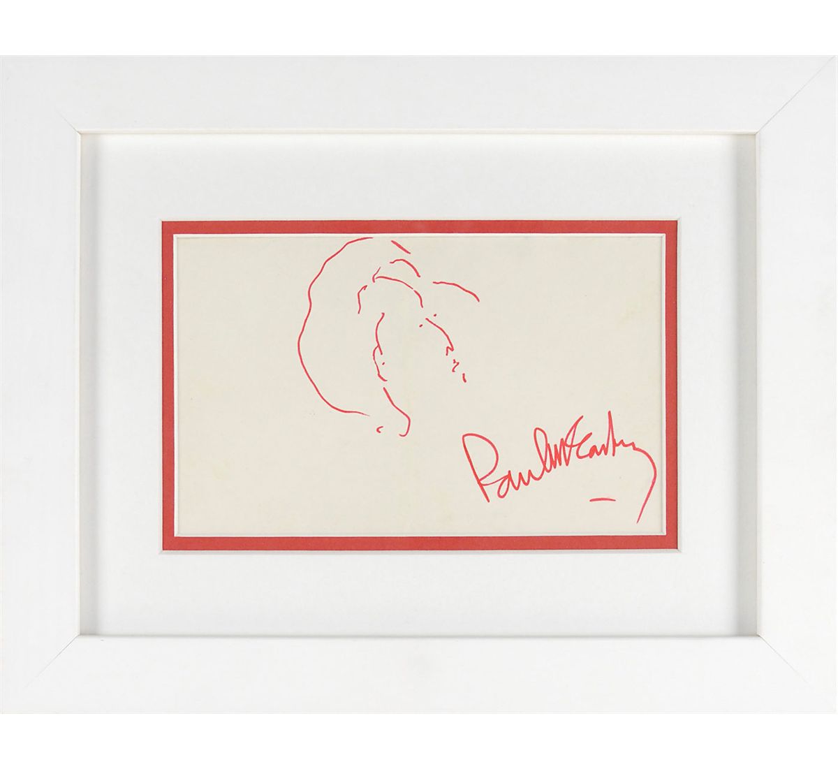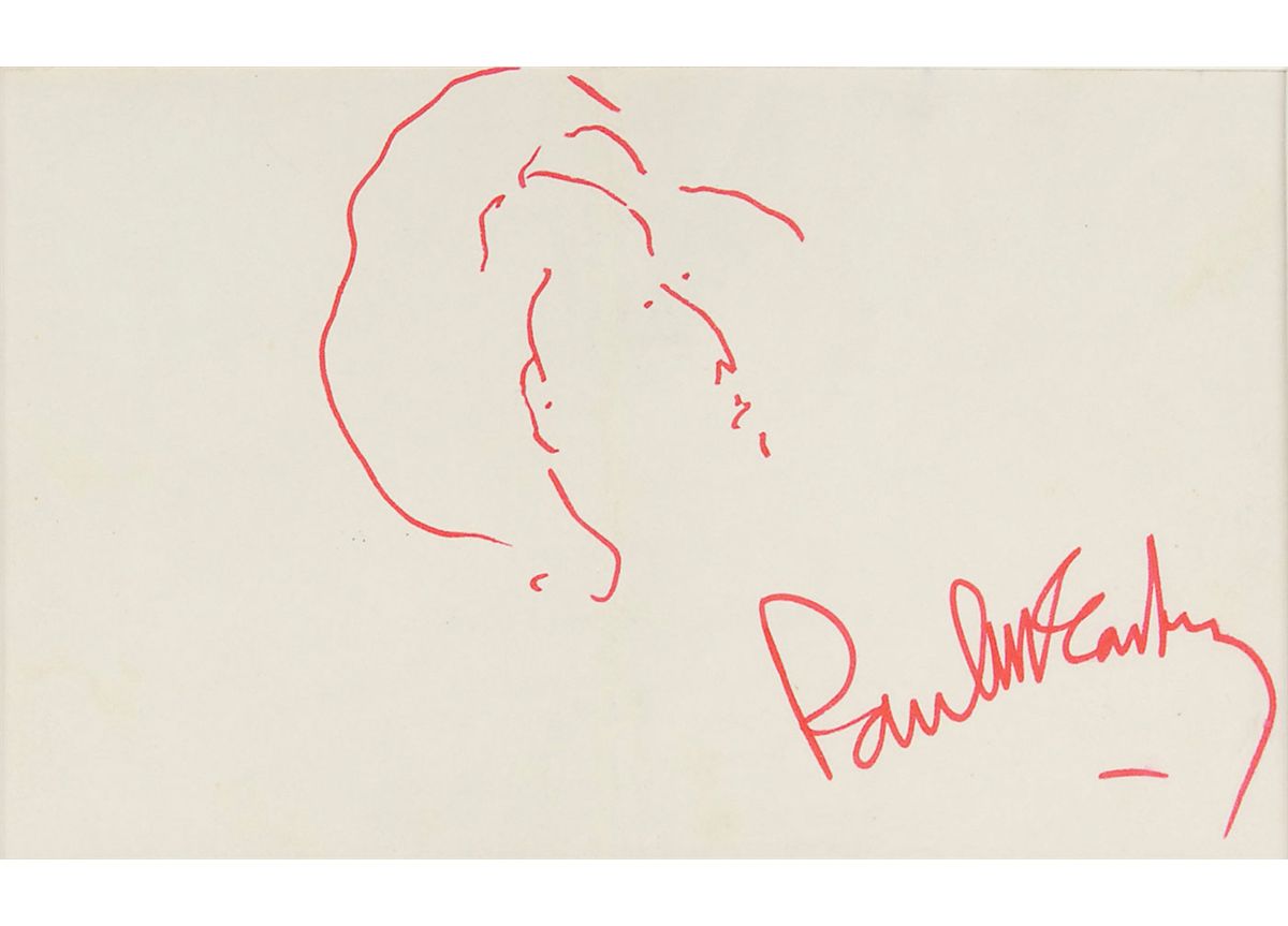 Original vintage signed red felt tip self-portrait on an off-white 6.5 x 4 card, nicely signed under the image, “Paul McCartney.” Double-matted and framed to an overall size of 11.25 x 9. In fine condition, with a very light central vertical fold. Accompanied by letters of authenticity from noted Beatles expert Perry Cox and Tracks. Also included is a detailed letter from the woman who obtained the sketch, in part: “This is a self portrait, which Paul McCartney drew & signed, Sunday 30.6.68, whilst visiting Bradford to play with the Black Dyke Mills Band. Myself & four friends were true Beatlemaniacs, this was the first time at 15 yrs old, that we had a chance to meet and talk to a Beatle. We arrived in Saltaire, only to find Paul had already left the rehearsal hall. All our excitement & anticipation ending in nothing. We pleaded & cried & pleaded again. Eventually the hall manager gave in & told us the hotel were Paul was staying. We arrived five minutes before he was due to leave. We were the only girls there…he talked & laughed for awhile. I cried & he wiped away a tear. I kissed his cheek.” Along with the provenance and sketch are an original 10 x 8 glossy publicity photo of McCartney and the Band, a contact sheet of 32 images from the session, a printed article about the recording session, and five second generation photos from that day. The Black Dyke Mills Band, formed in 1855, was one of the oldest and most successful brass bands in the world, and one of Apple Records’ first signed groups. The day that this sketch was obtained, Paul was with them recording their performance of the Lennon-McCartney composition ‘Thingumybob,’ which would become their first single for Apple Records. They also recorded a monumental performance of Yellow Submarine for the single’s b-side. An excellent self-portrait, made even more desirable by its extensive accompaniments, capturing a fruitful day of collaboration in the studio.