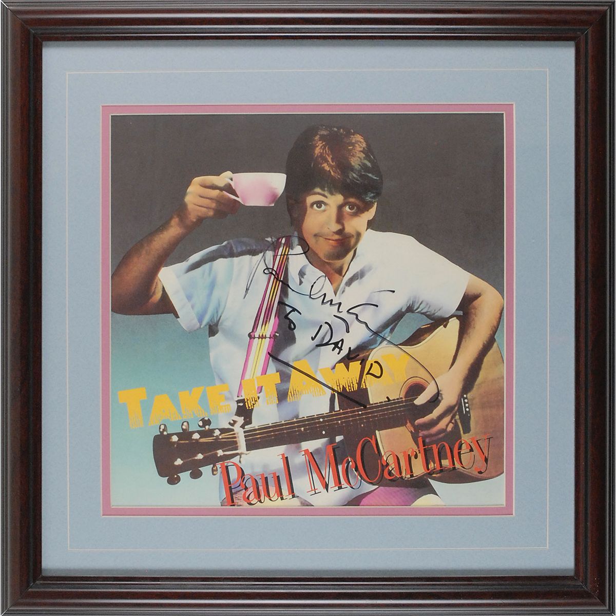 ‘Take It Away’ 12? single album signed and inscribed on the front cover in black felt tip, “Paul McCartney to David.” Double-matted and framed to an overall size of 18.25 x 18.25. In fine condition. Accompanied by a letter of provenance from the album’s original owner, who was given the signed album by an EMI plugger.
