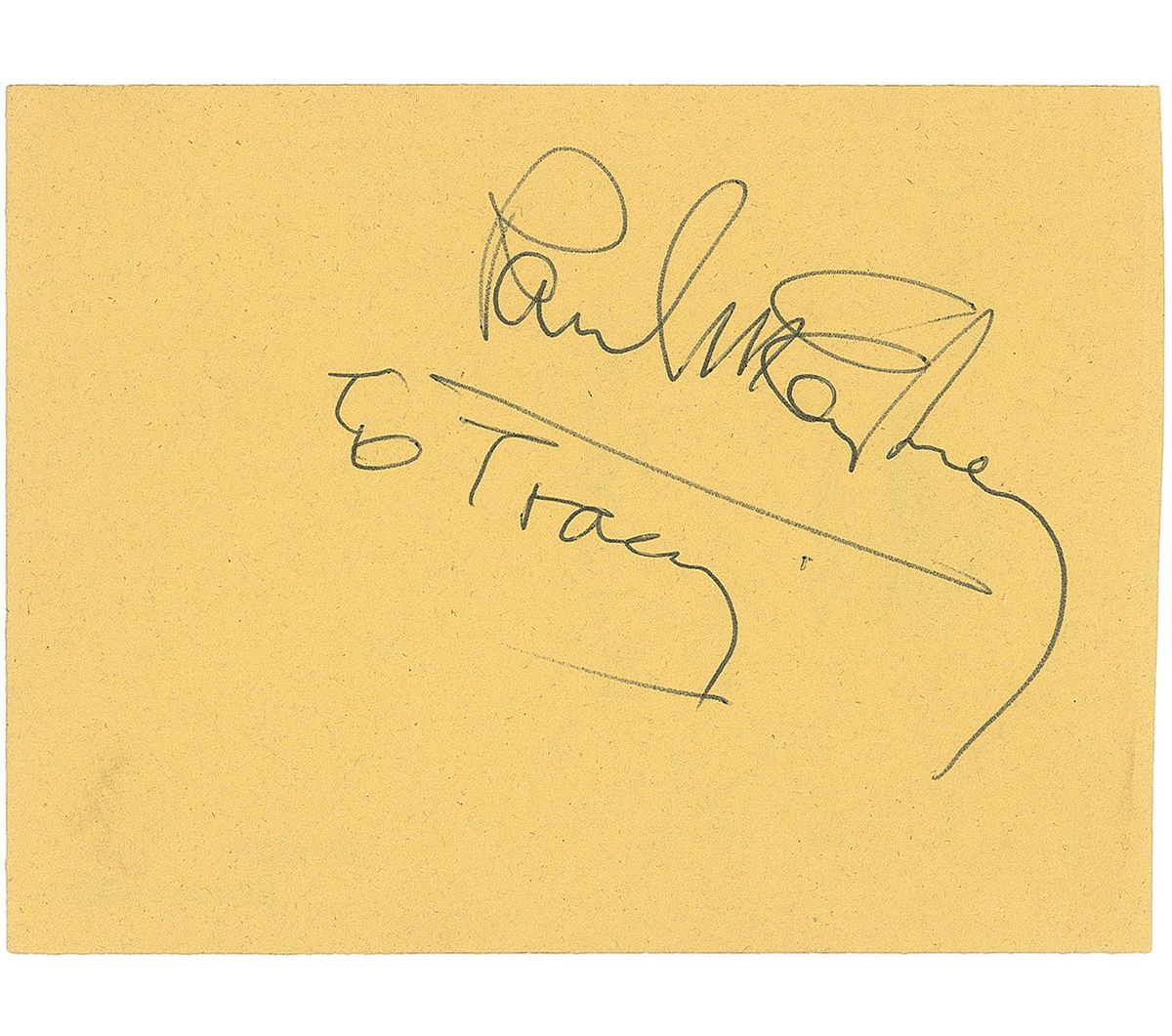 Nice ink signature and inscription, “Paul McCartney to Tracy,” on a light yellow 4.5 x 3.5 album page. In fine condition.