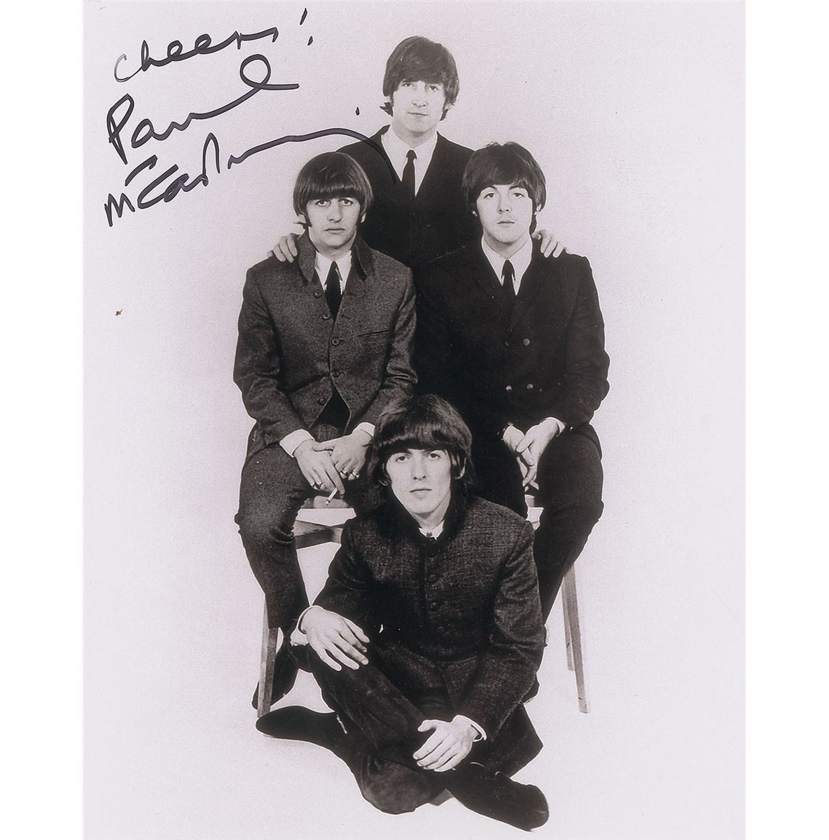 Glossy 8 x 10 group photo from the early years of the Beatles, signed in black felt tip, “Cheers! Paul McCartney.” In fine condition.