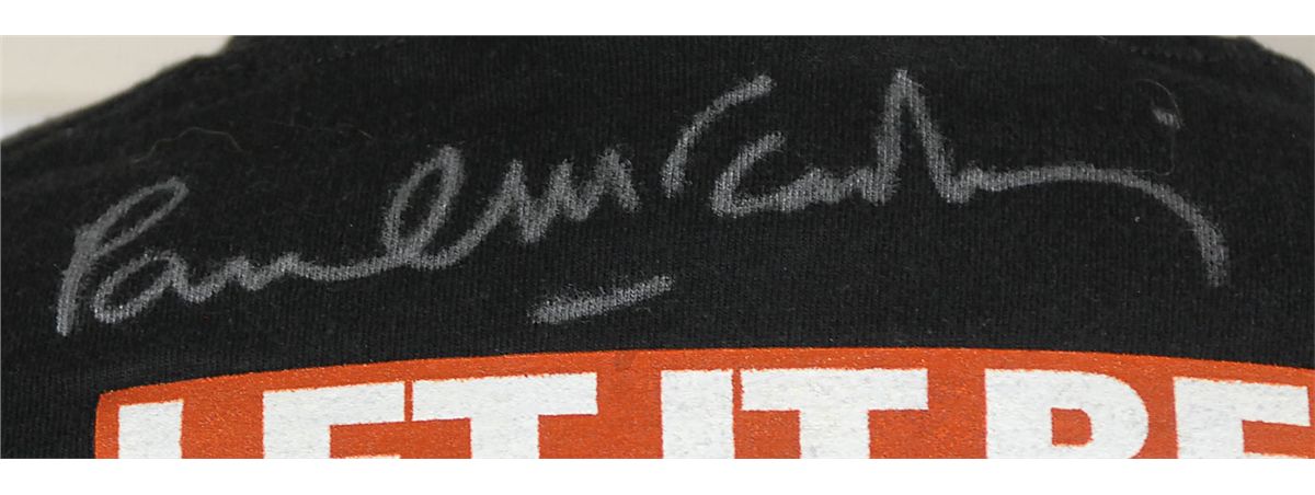 Black t-shirt featuring the Let It Be album cover on the front and text on the back, size medium, signed on the back in silver ink. In fine condition.