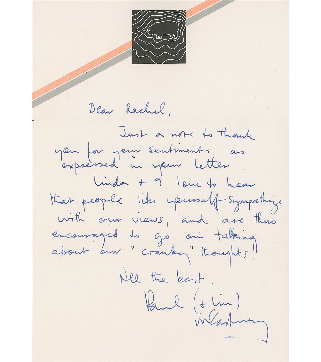 ALS entirely in McCartney’s hand, signed on behalf of himself and his wife, “Paul (& Lin) McCartney,” one page, 8.25 x 11.5, illustrated pig letterhead, no date but postmarked June 12, 1987. Letter reads, in full: “Just a note to thank you for your sentiments expressed in your letter. Linda & I love to hear that people like yourself sympathize with our views, and are thus encouraged to go on talking about our ‘cranky’ thoughts!” In fine, clean condition. Accompanied by the original mailing envelope, addressed in McCartney’s hand, as well as a certificate of authenticity from Tracks. In a 1984 newspaper article, McCartney described his views on ecology as ‘sort of cranky’—meaning eccentric—and promoted the ideas of animal rights and vegetarianism. McCartney is notoriously scarce in handwritten letters, even more so with such intriguing content.