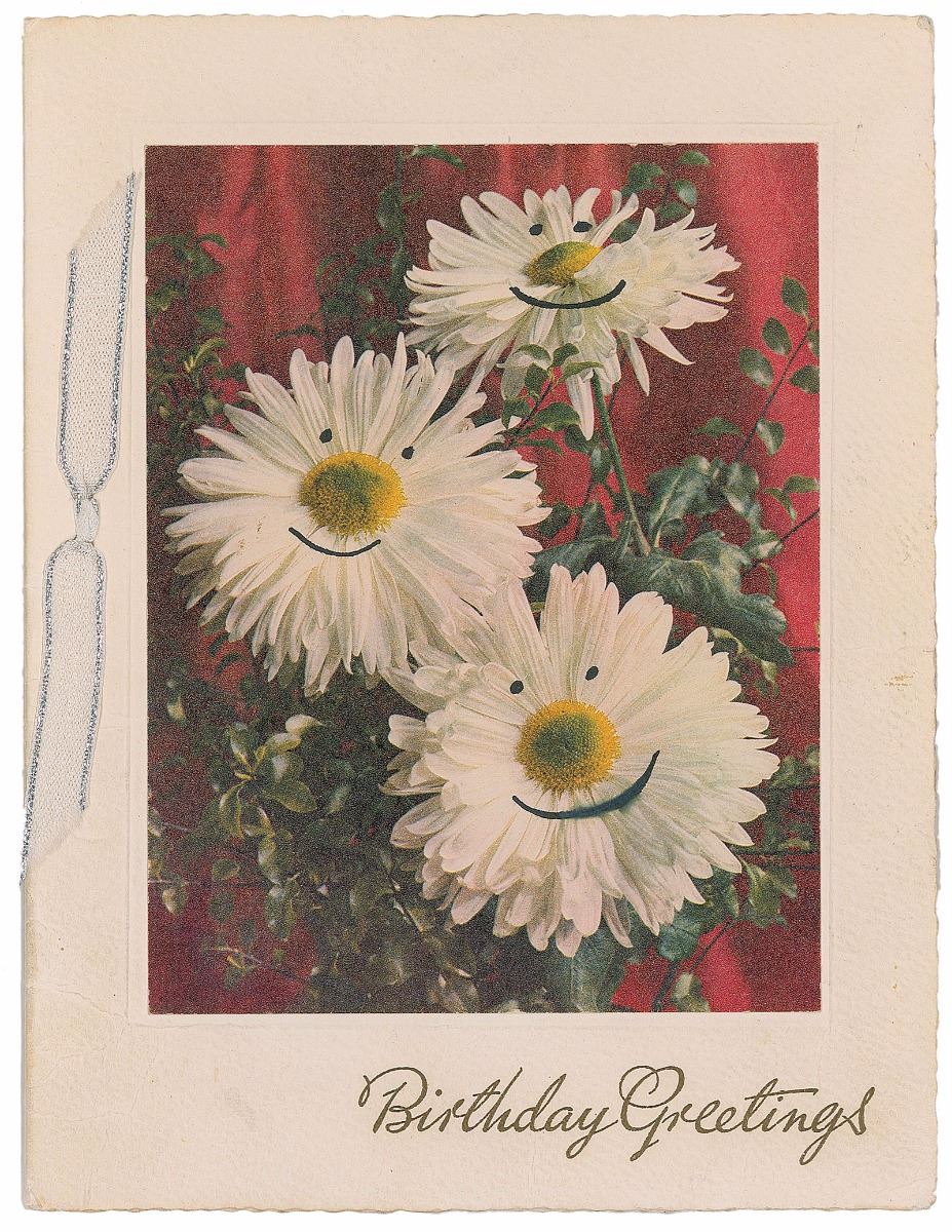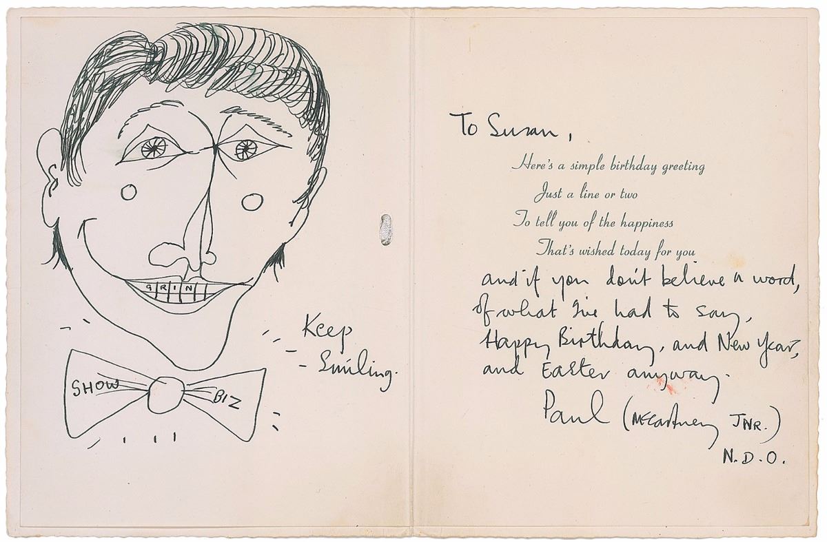 Fantastic circa 1963 birthday card depicting smiling daisies on the front, 5.75 x 7.75 closed, signed and inscribed inside in black ink to continue the printed poem inside, “To Susan…and if you don’t believe a word, of what I’ve had to say, Happy Birthday, and New Year, and Easter anyway. Paul (McCartney Jnr.), N. D. O.” On the left, McCartney adds a detailed sketch of a face with a bow tie reading “Show Biz,” with “Grin” written across his teeth and “Keep Smiling” on the right side. In fine condition, with a couple light stains slightly affecting a word or two of McCartney’s writing and light creases. Accompanied by a certificate of authenticity from Tracks and a letter of provenance from the recipient’s mother, in full: “This birthday card was sent by Paul McCartney to my daughter Susan Winstanley on her 13th birthday, while she was sick in Broadgreen Hospital at Liverpool.” A rare, early McCartney piece that certainly would have helped cheer up a young fan on her birthday.