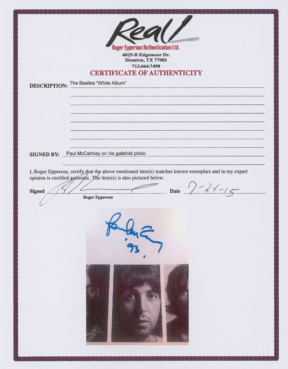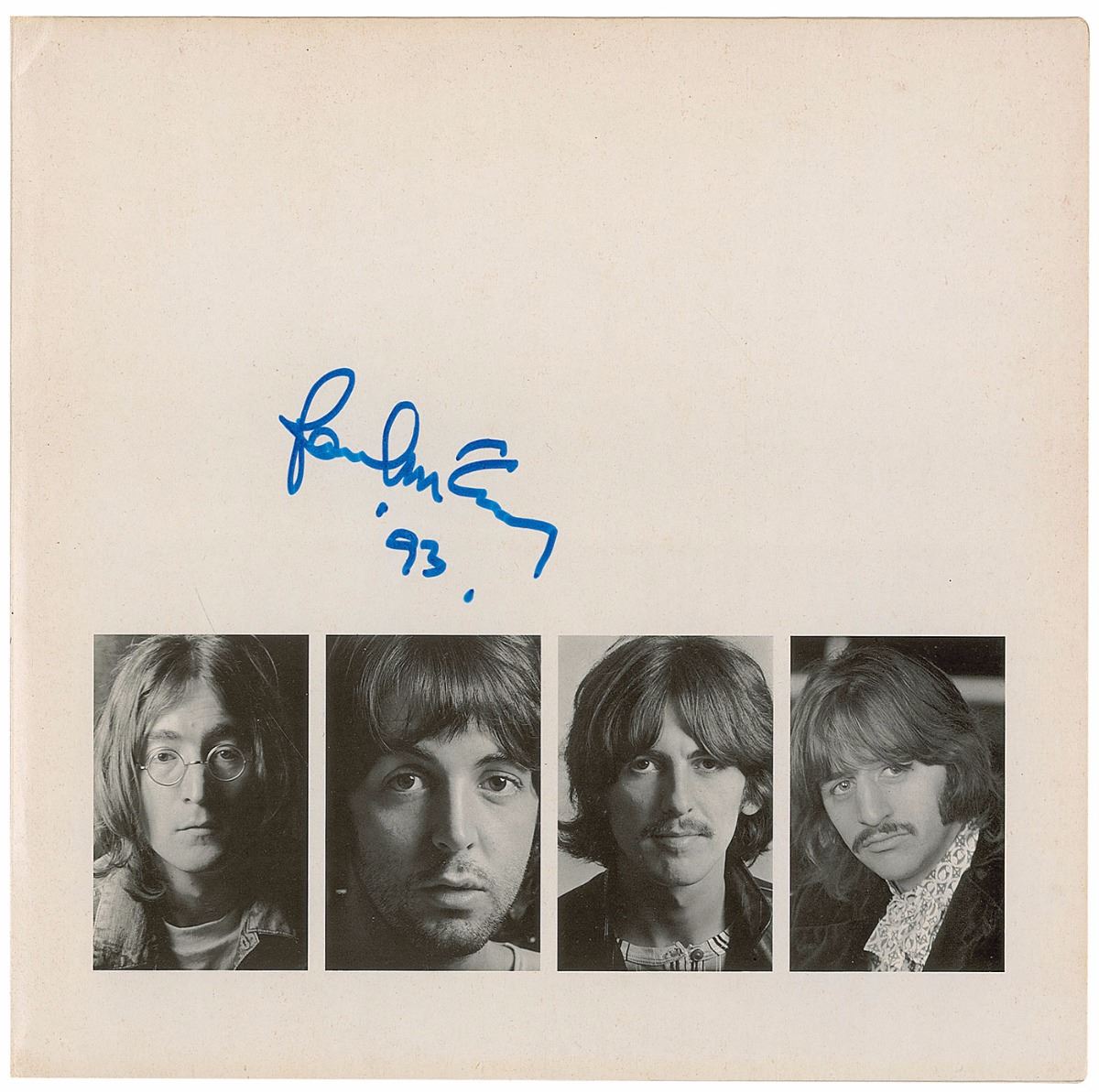 Original pressing White album signed on the inside gatefold in blue felt tip, “Paul McCartney, ’93.” Slight edgewear and toning, a horizontal bend, and a faint ‘ring of wear,’ otherwise fine condition. The record is not included. Accompanied by a full letter of authenticity from REAL.
