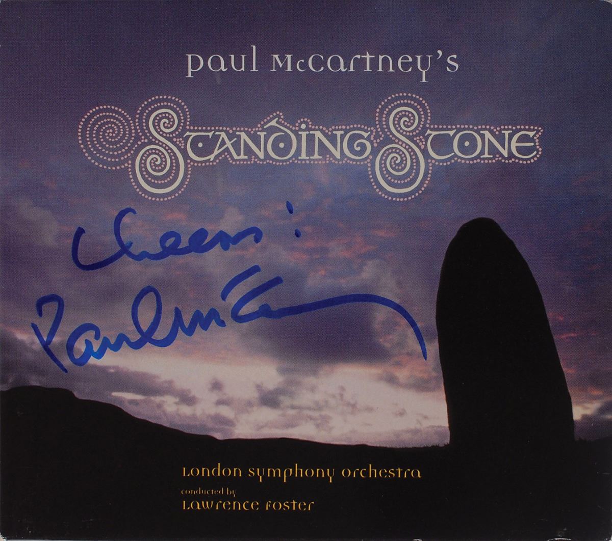 Standing Stone promotional CD signed on the front cover in blue felt tip, “Cheers! Paul McCartney.” In fine condition. The CD is included. Consignor notes that the signed CD was originally purchased at a charity function to raise funds for the Naomi House Children's Hospice in Hampshire.