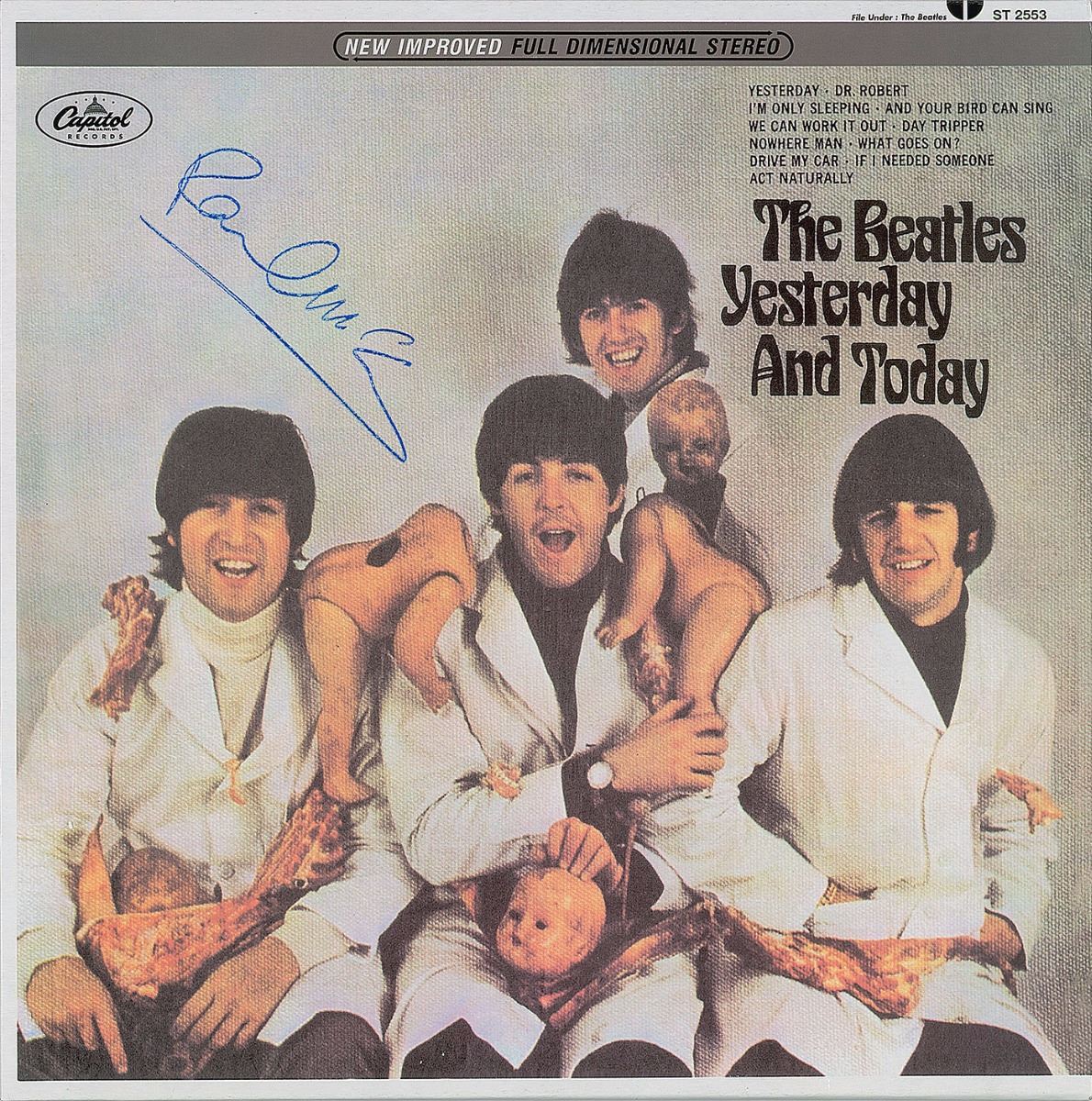 Yesterday and Today reproduction ‘butcher’ album signed on the front cover in blue felt tip by McCartney. In fine condition. The record is included.