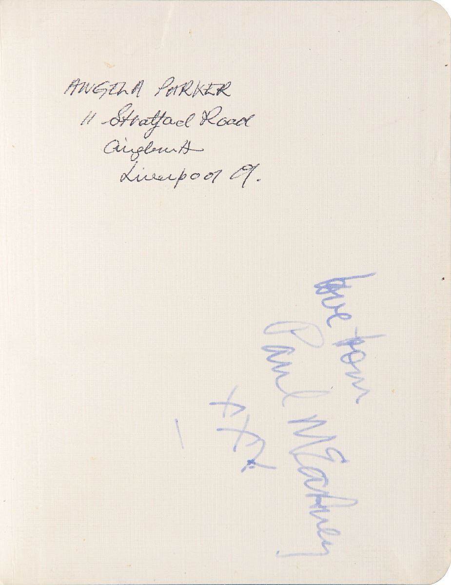Attractive blue ink signature, “love from, Paul McCartney, XXX,” on the rear pastedown of a leather 4 x 5 autograph book. Pastedown also bears ink ownership notations. In fine condition. Accompanied by a letter of provenance from the original recipient, in part: “My maiden name was Angela Buckland Parker and I lived at 11 Stratford Road, Aigburth, Liverpool 19. During 1961 I was at college in Liverpool and regularly visited the Cavern on my way home from College…As a young girl aged 16, Paul McCartney was my favourite member and the most attractive member of the Beatles so it was on one of my visits to the Cavern prior to an evening performance that I spotted Paul and only had my address book available to obtain his autograph so I stopped him on his way in and have kept that memento to this day.”