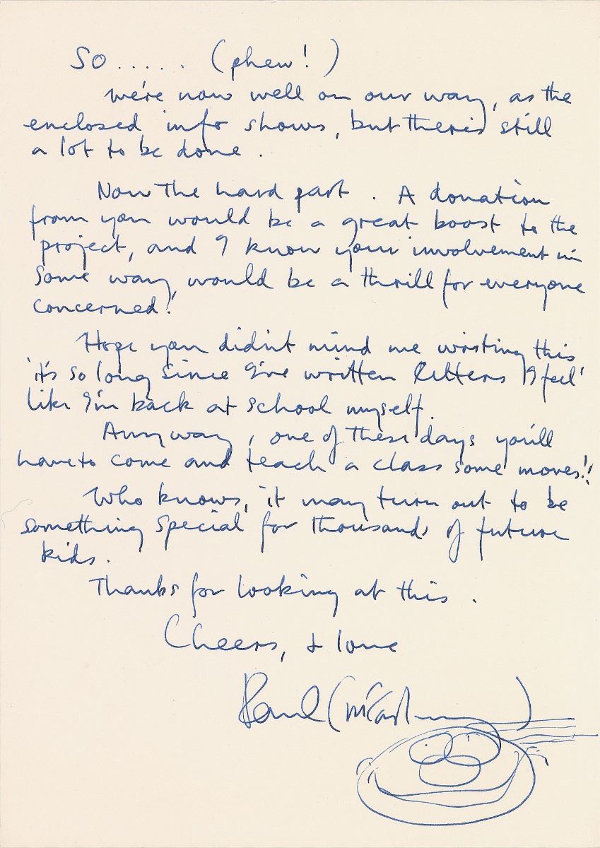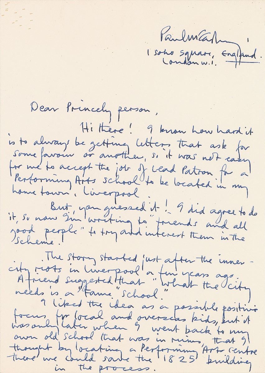 ALS signed at the top of the first page, “Paul McCartney,” and at the conclusion, “Paul (McCartney),” two pages, 8.25 x 11.75, no date. Incredible letter to Prince, beginning “Dear Princely person,” concerning his efforts in establishing the Liverpool Institute for Performing Arts. In full: “Hi there! I know how hard it is to always be getting letters that ask for some favour or another, so it was not easy for me to accept the job of Lead Patron for a Performing Arts School to be located in my home town, Liverpool. But, you guessed it! I did agree to do it, so now I'm writing to ‘friends and all good people’ to try and interest them in the scheme. The story started just after the inner-city riots in Liverpool a few years ago. A friend suggested that ‘what the city needs is a ‘Fame’ School.’ I liked the idea as a possible positive focus for local and overseas kids, but it was only later when I went back to my own old school that was in ruins, that I thought by locating a Performing Arts Centre there we could save the 1825 building in the process. So…(phew!) We're now well on our way, as the enclosed info shows, but there's still a lot to be done. Now the hard part. A donation from you would be a great boost to the project, and I know your involvement in some way, would be a thrill for everyone concerned. Hope you didn't mind me writing this, it's so long since I've written letters I feel like I'm back at school myself. Anyway, one of these days you'll have to come and teach a class some moves!! Who knows, it may turn out to be something special for thousands of future kids. Thanks for looking at this.” McCartney also sketches a smiley face at the end. In fine condition, with a light paperclip impression to top edge.