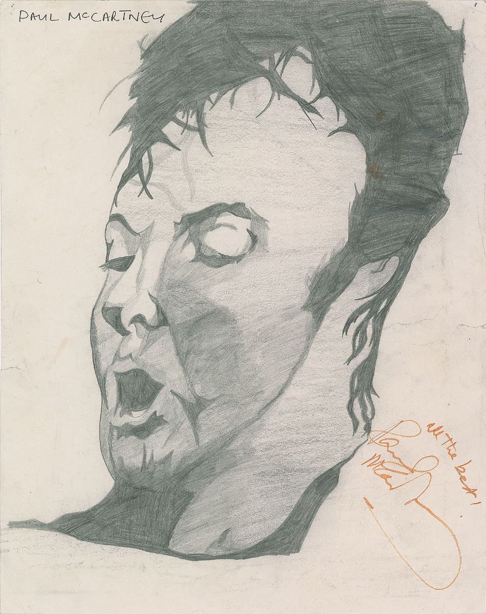 Original graphite sketch of a singing Paul McCartney on an off-white 11.5 x 14.25 sheet, signed in the lower right in orange felt tip, “All the best! Paul McCartney.” Upper left corner bears an ink notation by the unknown artist. In very good to fine condition, with scattered overall creasing and two small tears to edges.