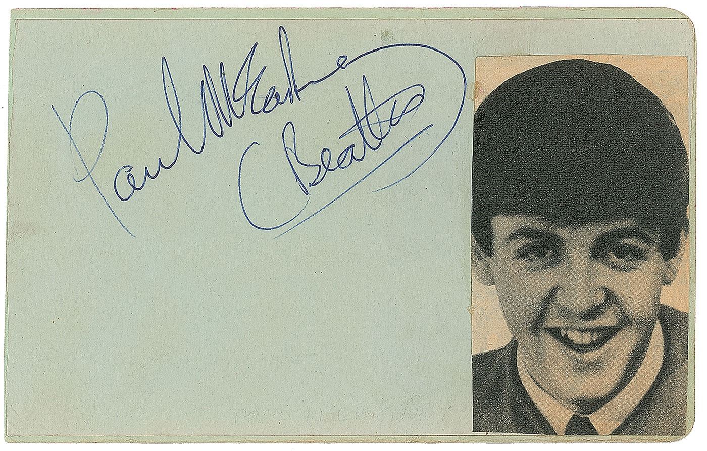 Crisp ballpoint signature, "Paul McCartney (Beatles),” on a light green 5.25 x 3.25 album page bearing an affixed image of the Beatles bassist. In fine condition.
