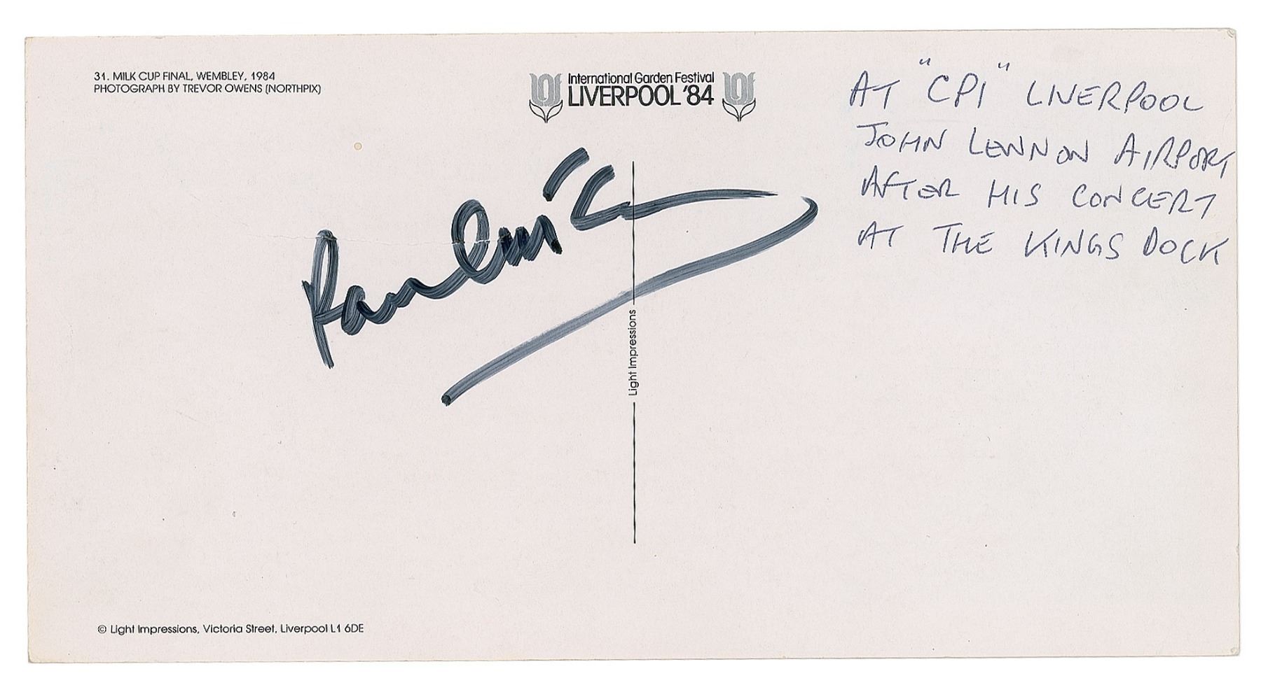 Promotional card for the 1984 Liverpool vs. Everton Football Milk Cup, showing the two clubs posing on the front, 9.5 x 5, signed on the reverse in black felt tip by McCartney. Reverse bears collector’s ink notations indicating that the signature was obtained at Liverpool’s John Lennon Airport following a McCartney concert at The King’s Dock. In very good to fine condition, with light handling wear, and a crease passing through several letters of the signature. Accompanied by a certificate of authenticity from Tracks.