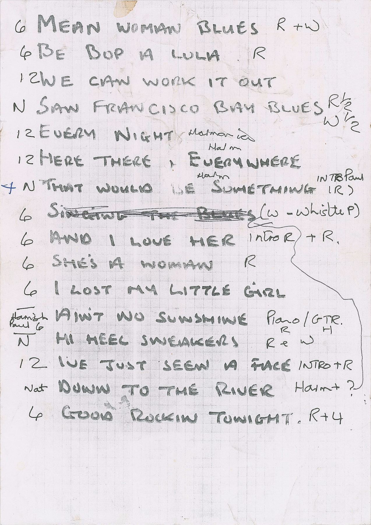 Printed set list hand-annotated by Paul McCartney prior to his concert at Cornwall Coliseum on June 7, 1991, two pages, 8.25 x 11.75. The sheets feature a total of 27 songs and bear numerous black ink notations written in McCartney's hand, consisting of various numerical and instrumental reminders, such as: "Harmonica" during 'Every Night'; "Hamish, Paul 6" and "Piano R/ Gtr. H" during 'Ain't No Sunshine'; and "Bass" for 'Coming Up,' 'Long & Winding Road,' and 'Let It Be.' In very good to fine condition, with moderate overall creasing and handling wear. Accompanied by a concert ticket for the show, as well as two backstage passes.