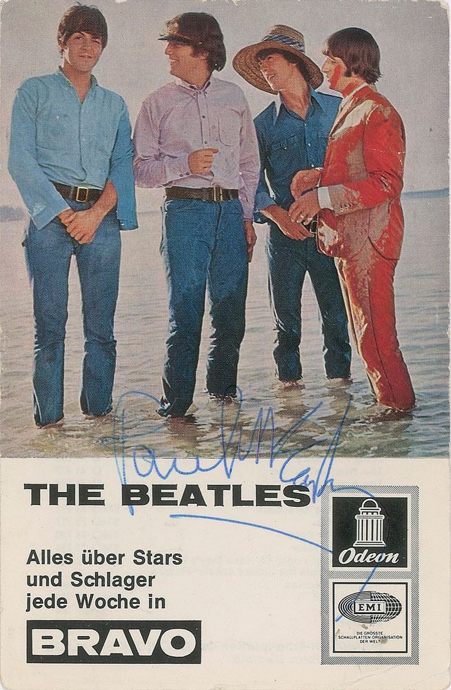 Uncommon color 3.75 x 5.5 German photo card of the Beatles standing in a body of water, signed in blue ballpoint by Paul McCartney. In very good to fine condition, with scattered light creasing.