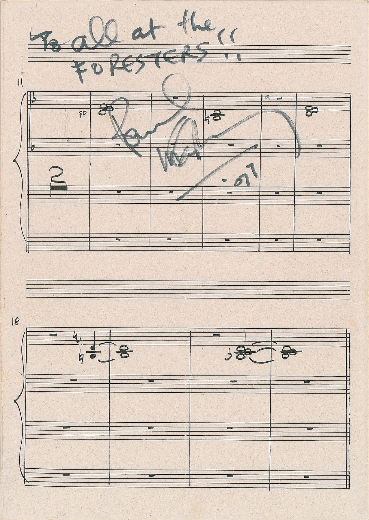 Felt tip signature and inscription, "To all at the Foresters!! Paul McCartney, 97,” on an off-white 8.25 x 11.5 page of sheet music. In fine condition, with light handling wear. Accompanied by a certificate of authenticity from Tracks.