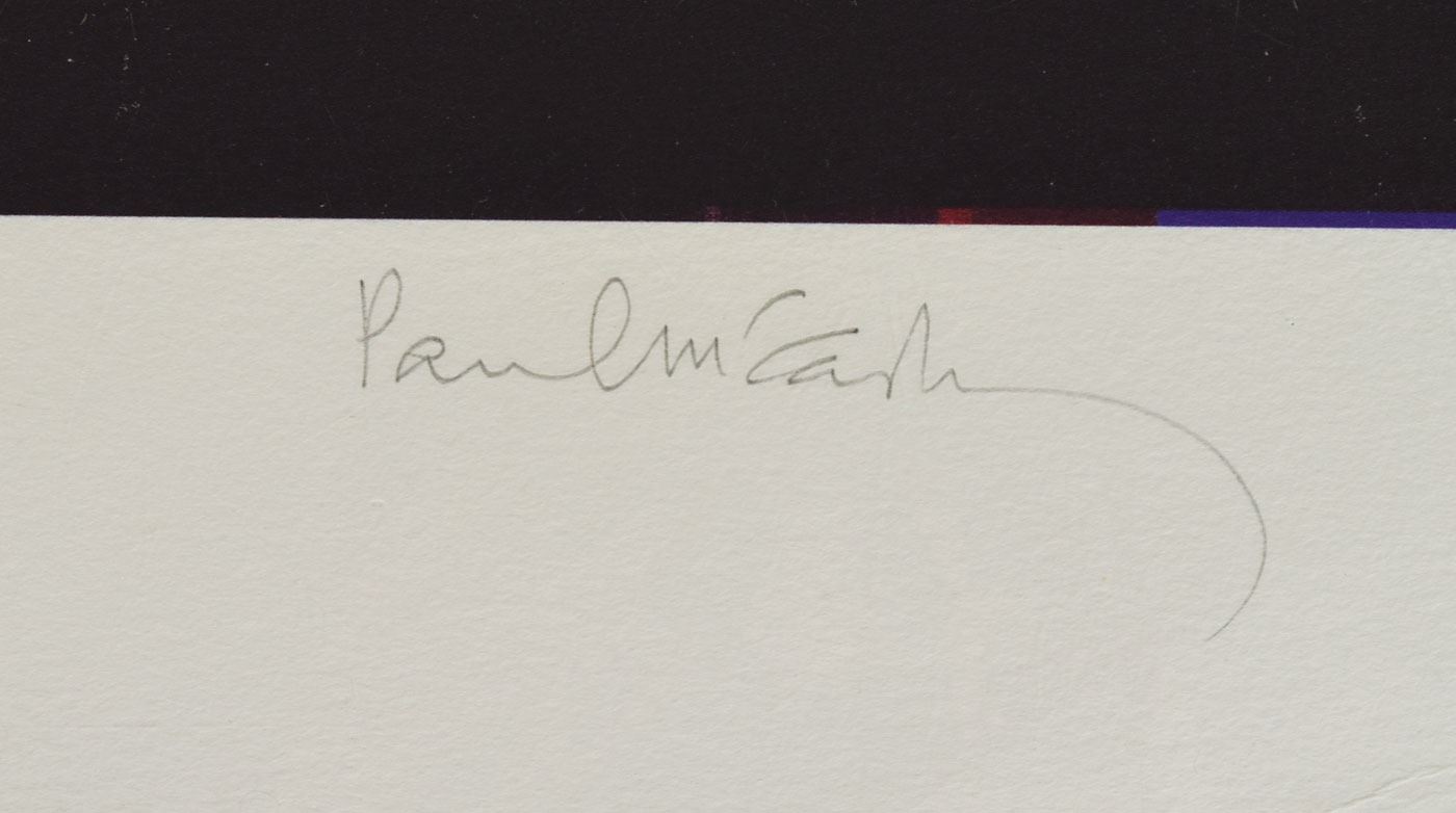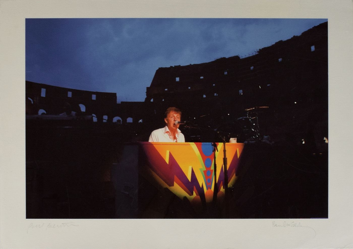 Color 27.25 x 19.25 print of a Bill Bernstein photo showing Paul McCartney singing and playing a piano inside Rome's Colosseum, signed in the lower border in pencil by both McCartney and Bernstein. In very fine condition. McCartney commissioned photographers, including Bernstein, to chronicle his life on the road and document his 2002-2003 world tour, with only 43 images selected to be signed by Sir Paul and then auctioned in 2006 through London-based Proud Galleries. This particular image was used in McCartney's 2004 book Each One Believing: On Stage, Off Stage, and Backstage.