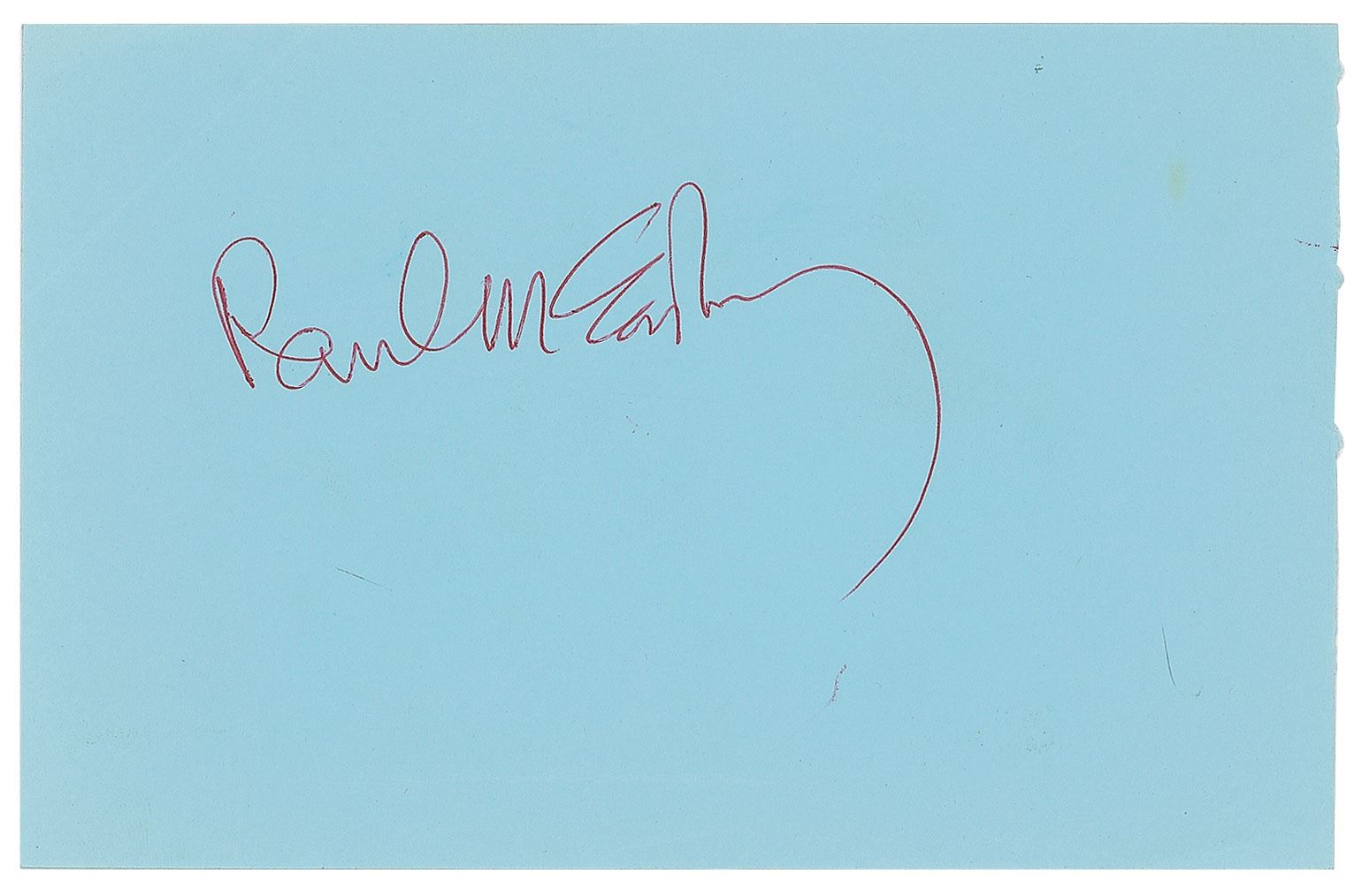 Red ballpoint signature, "Paul McCartney,” on a light blue 6 x 4 album page. In fine condition, with some light creasing. Accompanied by a certificate of authenticity from Tracks and a letter of provenance from the original recipient: "I was working as a telephonist at The Randolph Hotel, Oxford [and] Wings we're playing their first and only concert at The New Theatre, Oxford on Saturday 12th May 1973. Paul & Linda McCartney were staying at The Randolph Hotel and on the Sunday as they were leaving I approached Paul and asked for his autograph which he kindly wrote for me."
