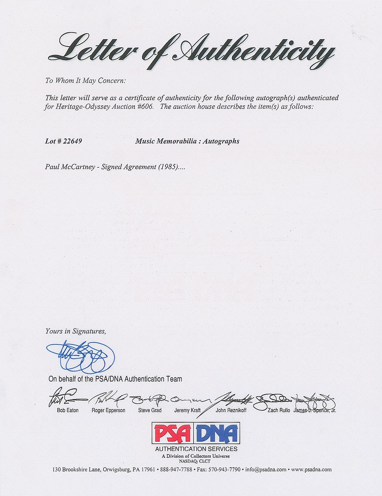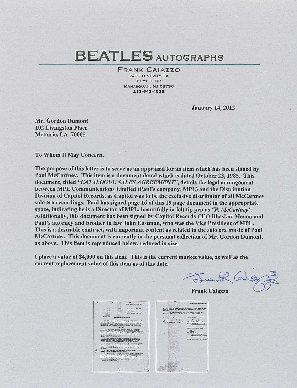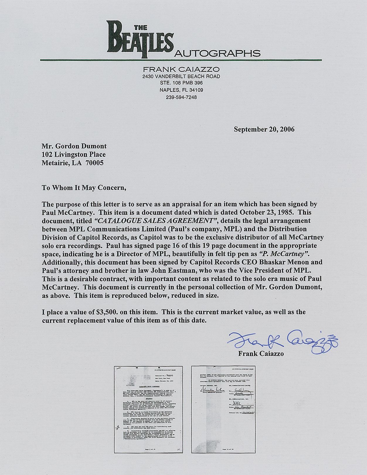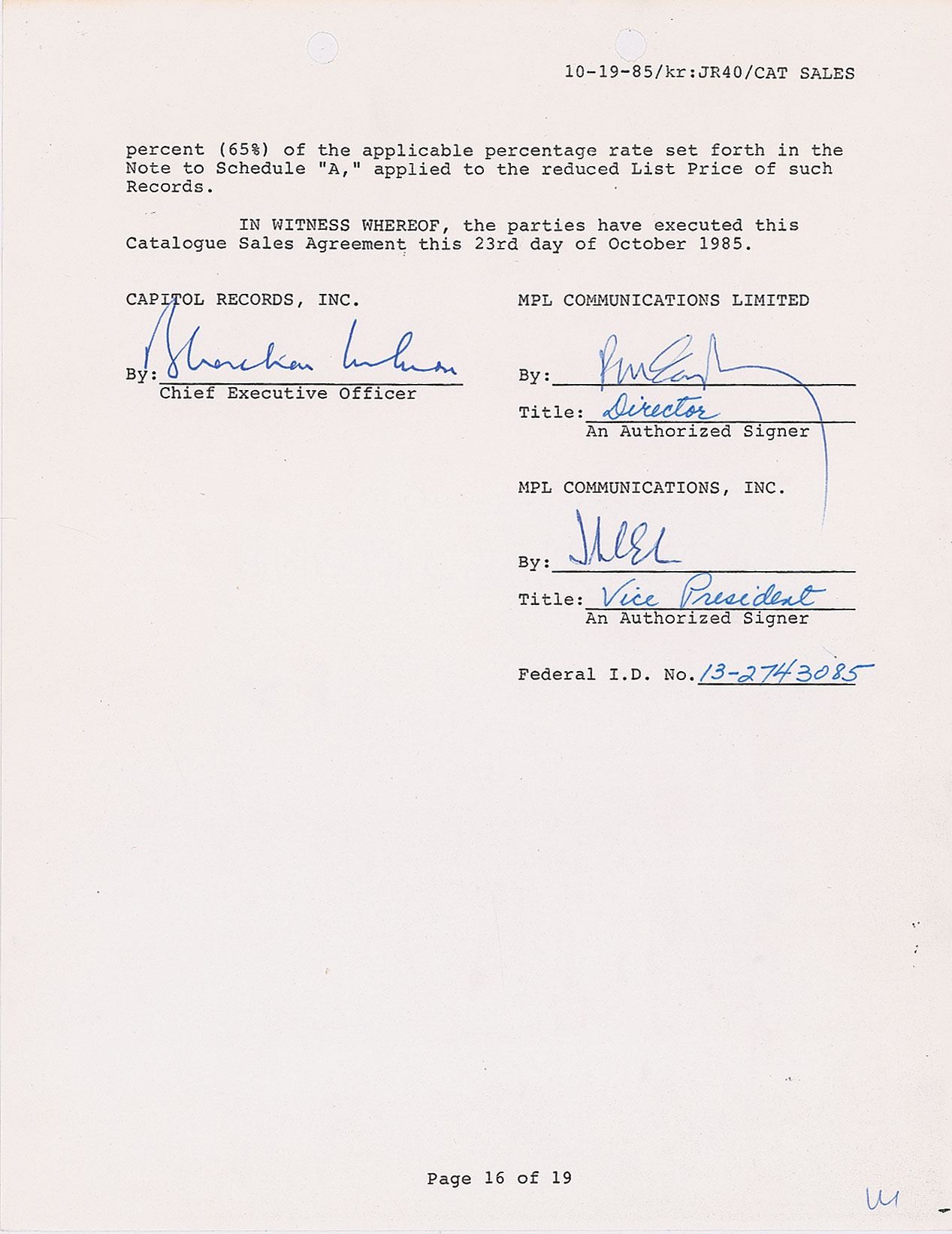 DS, sixteen pages, 8.5 x 11, October 23, 1985. A catalogue sales agreement between MPL Communications, Inc., and MPL Communications Limited and the Distribution Division of Capitol Records, Inc., in which MPL desires to engage Capitol Records "as the exclusive distributor in the USA" for single records by Paul McCartney, who signs on the last page in blue ballpoint as the director of MPL Communications Limited. In fine condition. Accompanied by a letter of authenticity from noted Beatles expert Frank Caiazzo.