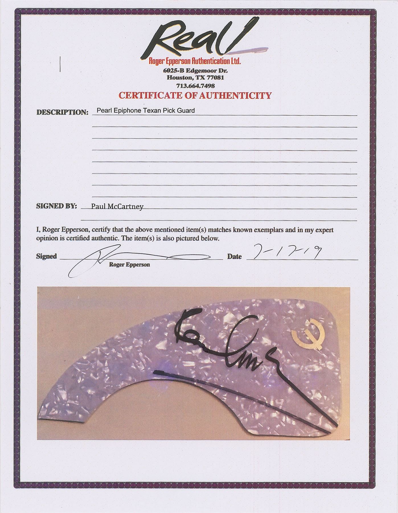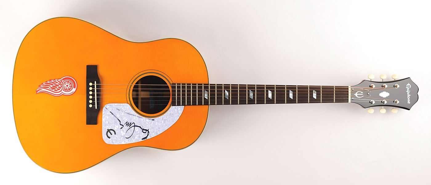 Handsome Epiphone FT-79 acoustic guitar with a natural finish and a Detroit Red Wings sticker affixed below bridge, signed on the pearloid pickguard in black felt tip by Paul McCartney. In very fine condition. A particularly attractive instrument with Red Wings emblem added to resemble the guitar played by the Beatles great. Accompanied by a full letter of authenticity from REAL.