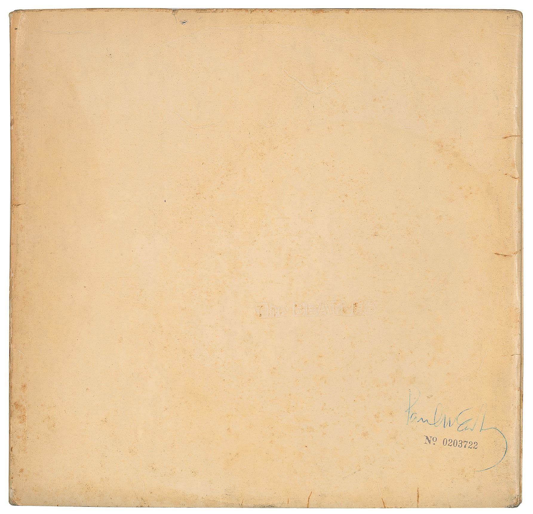 Self-titled 'White' album by the Beatles, signed on the front cover in blue ballpoint by Paul McCartney. In very good condition, with overall foxing, staining, edge wear, and some skipping to the signature. The record is included. Consignor notes that the autograph was obtained at the Hotel Montíboli in Alicante, Spain in the summer of 1972 while on vacation with his wife Linda and their daughter Stella. Includes a letter of provenance from the previous Spanish owner, who notes that McCartney 'signed this album for a fan called Henrriette, this took place on the terrace of the Montibal Hotel in the Alicante town of Villajoyosa in the summer of 1972.' Accompanied by a certificate of authenticity from Tracks.